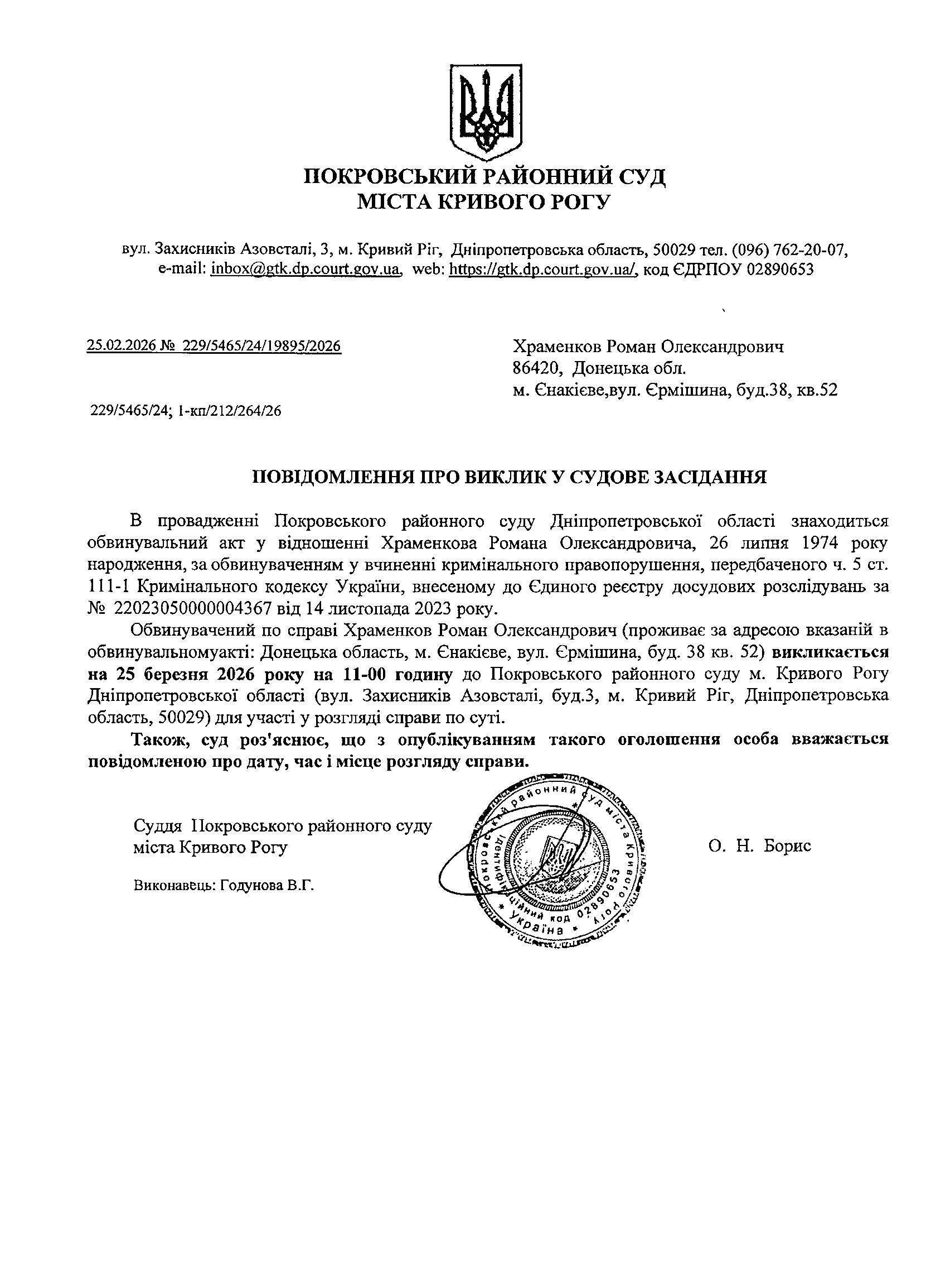 Оголошення про виклик до суду Храменкова Романа Олександровича