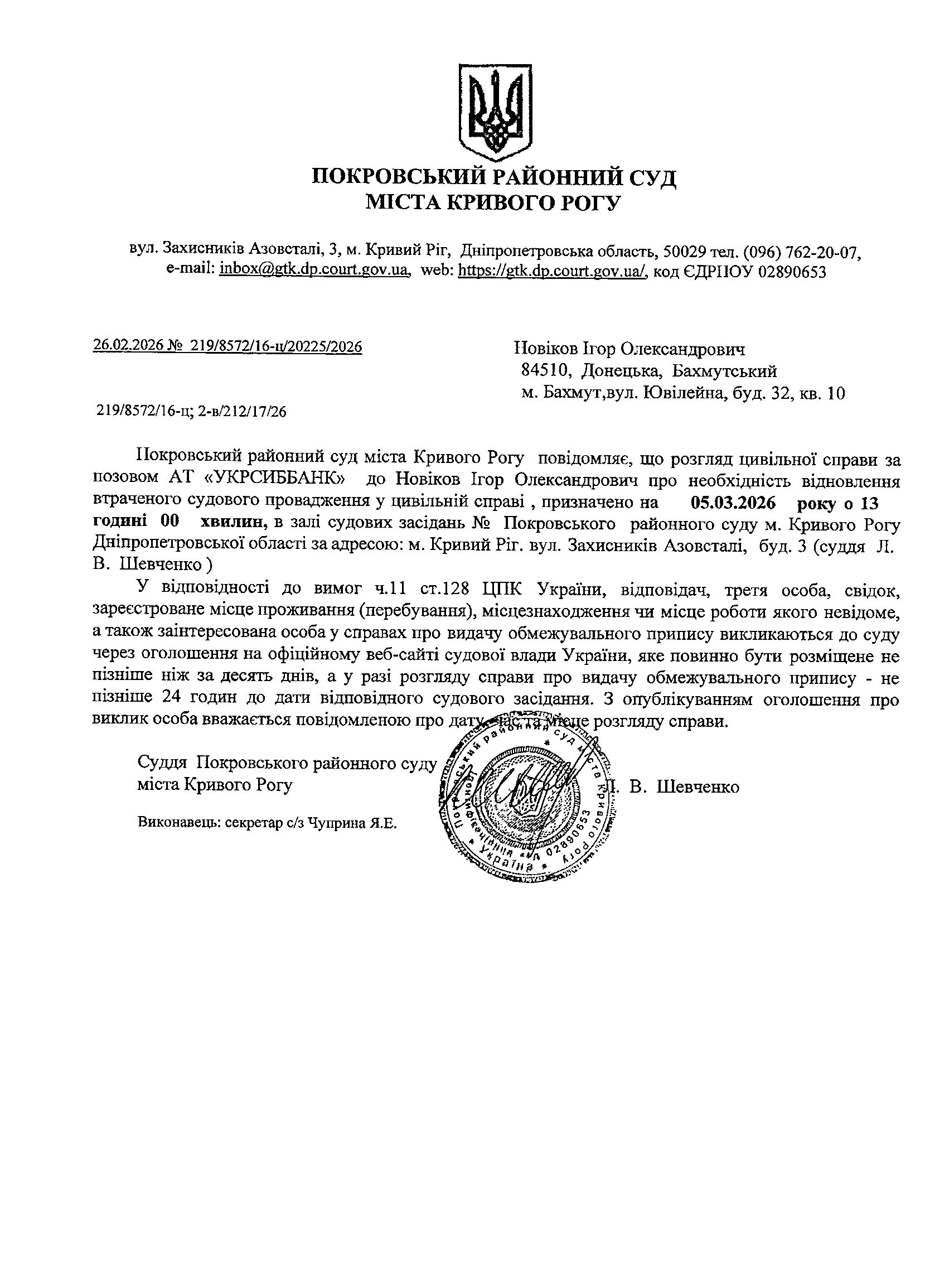 Оголошення про виклик до суду Новікова Ігоря Олександровича