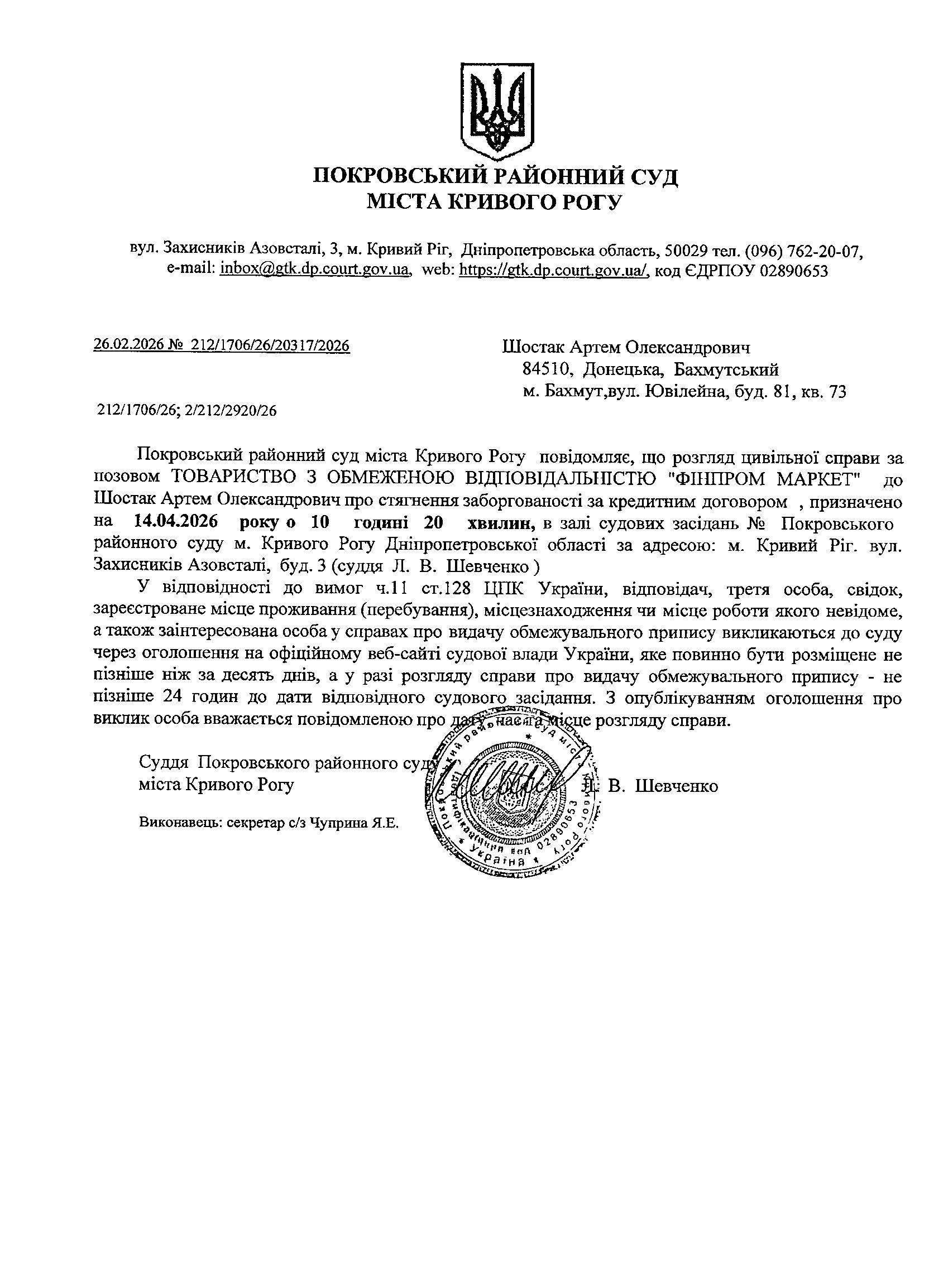 Оголошення про виклик до суду Шостака Артема Олександровича