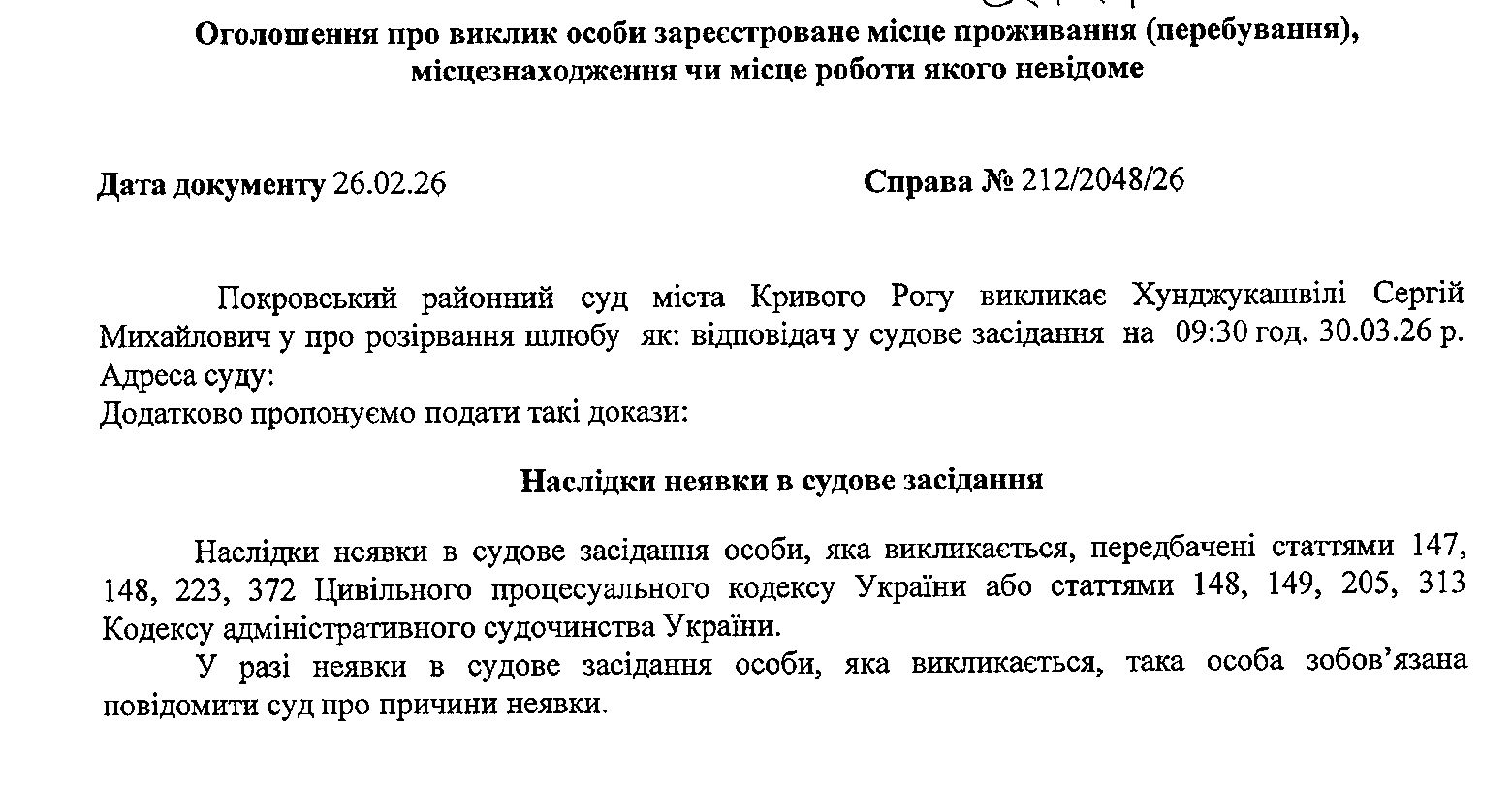 Оголошення про виклик до суду Хунджукашвілі Сергія Михайловича