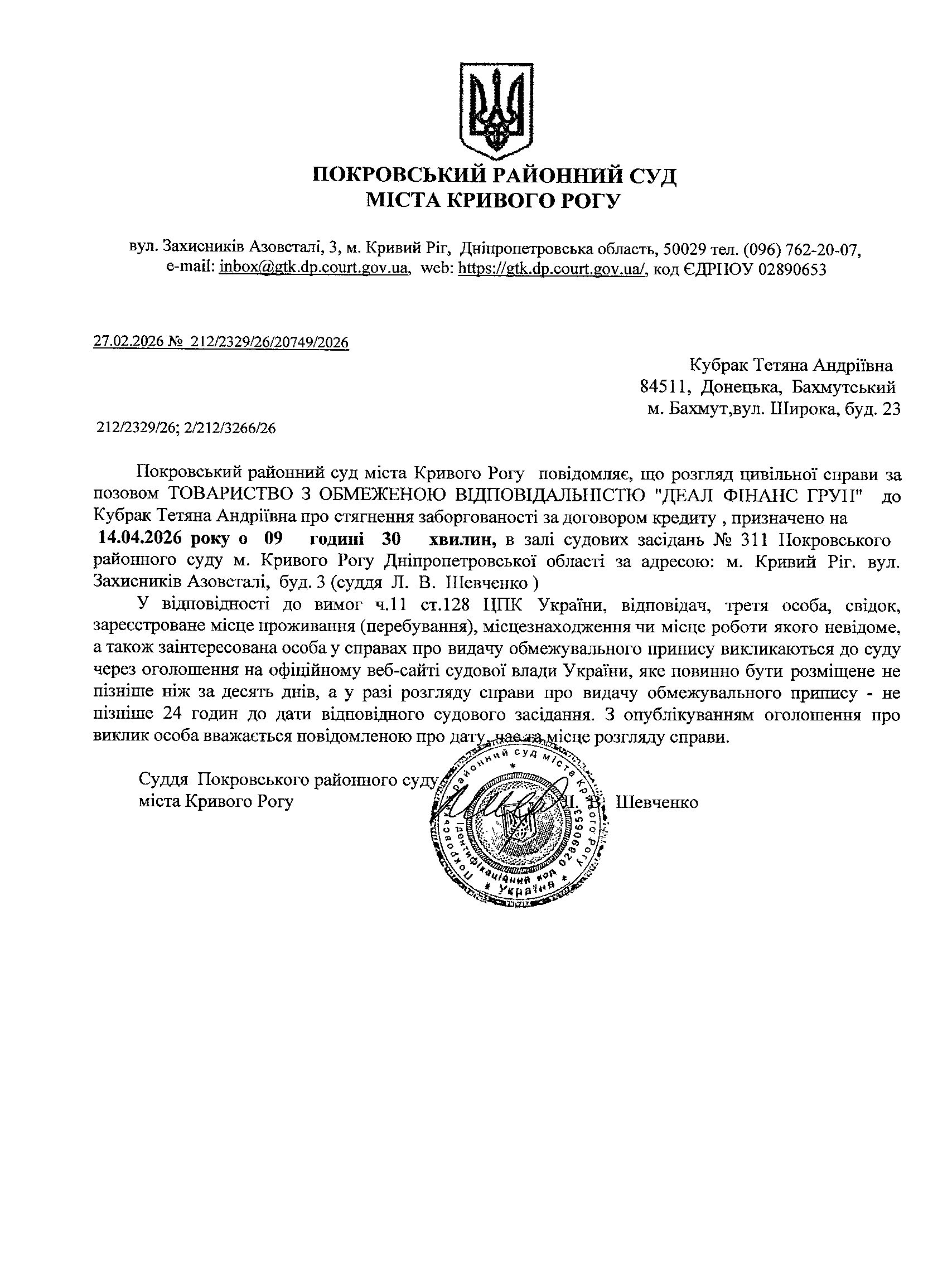 Оголошення про виклик до суду Кубрак Тетяни Андріївни