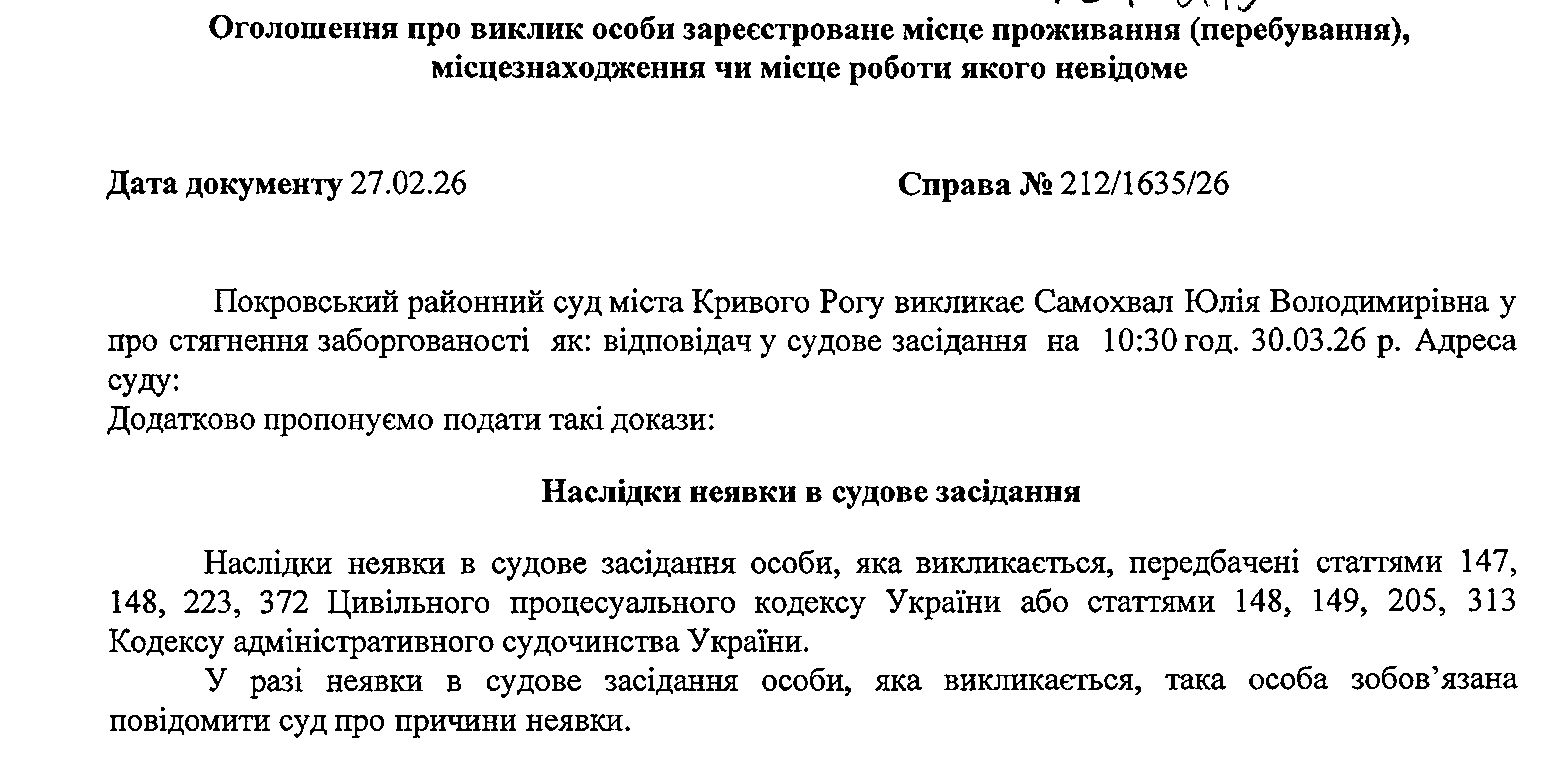 Оголошення про виклик до суду Самохвал Юлії Володимирівни