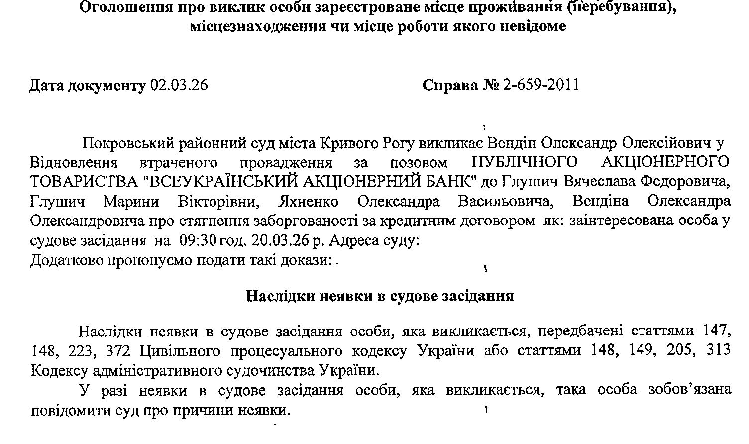 Оголошення про виклик до суду Вендіна Олександра Олексійовича