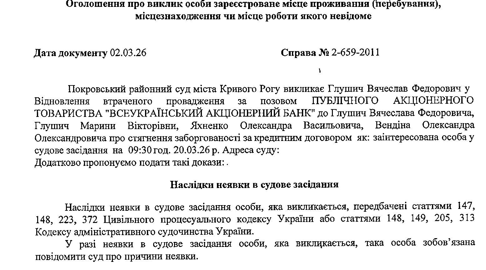 Оголошення про виклик до суду Глушича Вячеслава Федоровиа
