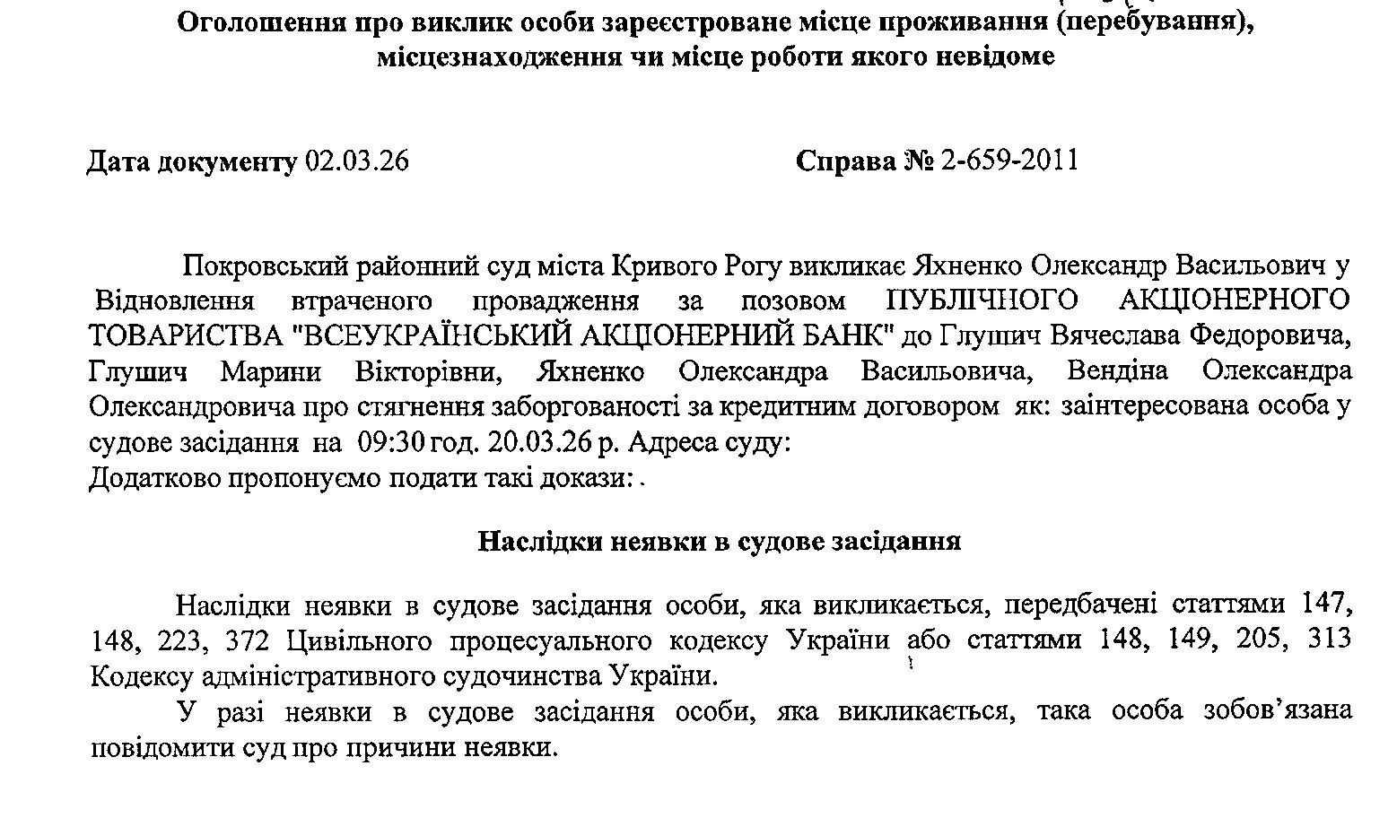 Оголошення про виклик до суду Яхненко Олександра Васильовича