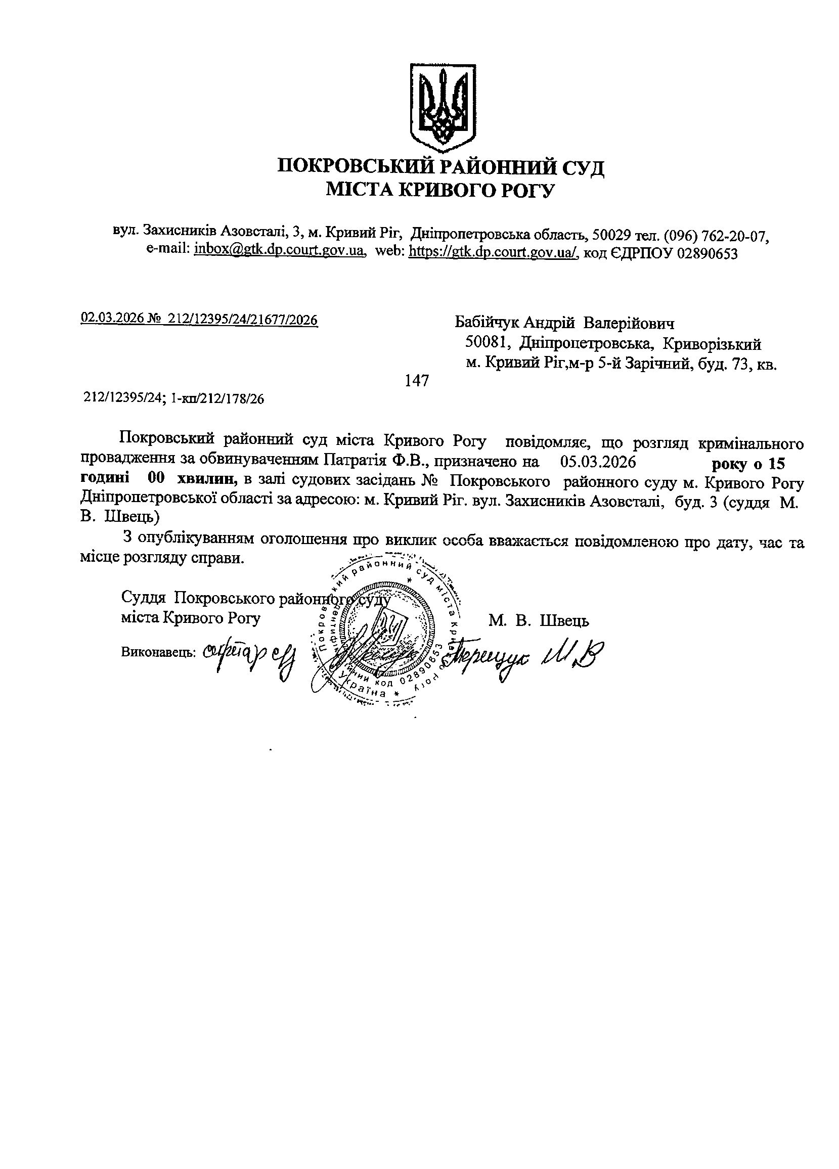 Оголошення про виклик до суду Бабійчука Андрія Валерійовича