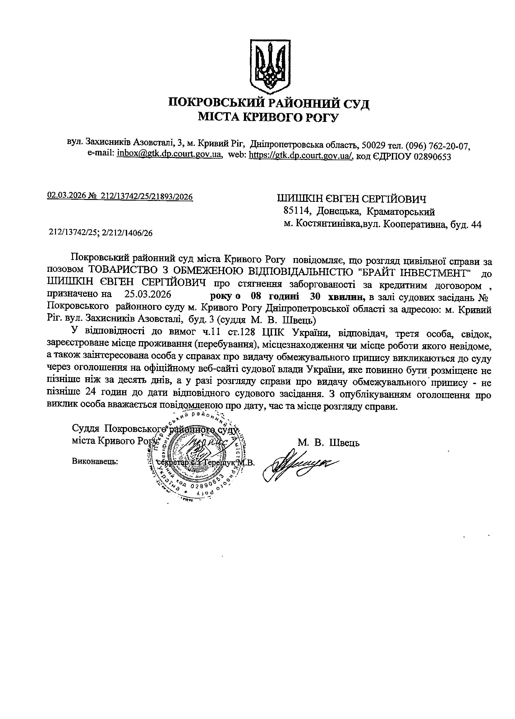 Оголошення про виклик до суду Шишкіна Євгена Сергійовича