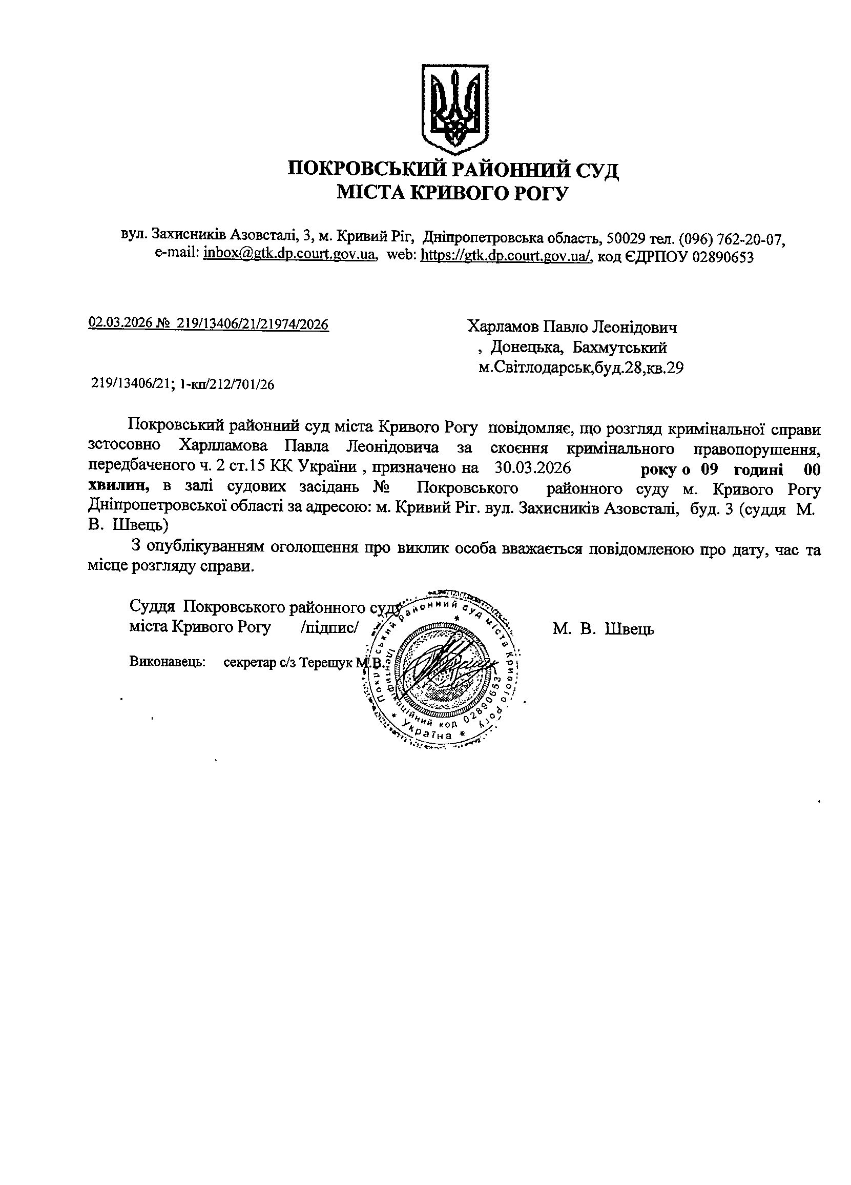 Оголошення про виклик до суду Харламова Павла Леонідовича