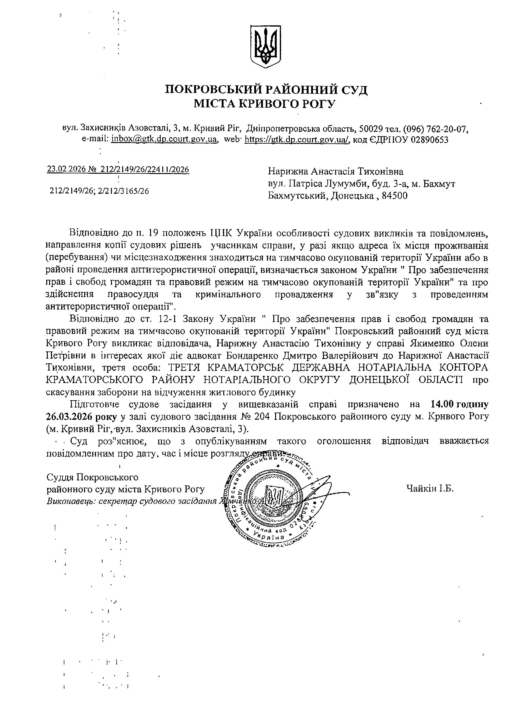 Оголошення про виклик до суду Нарижної Анастасії Тихонівни