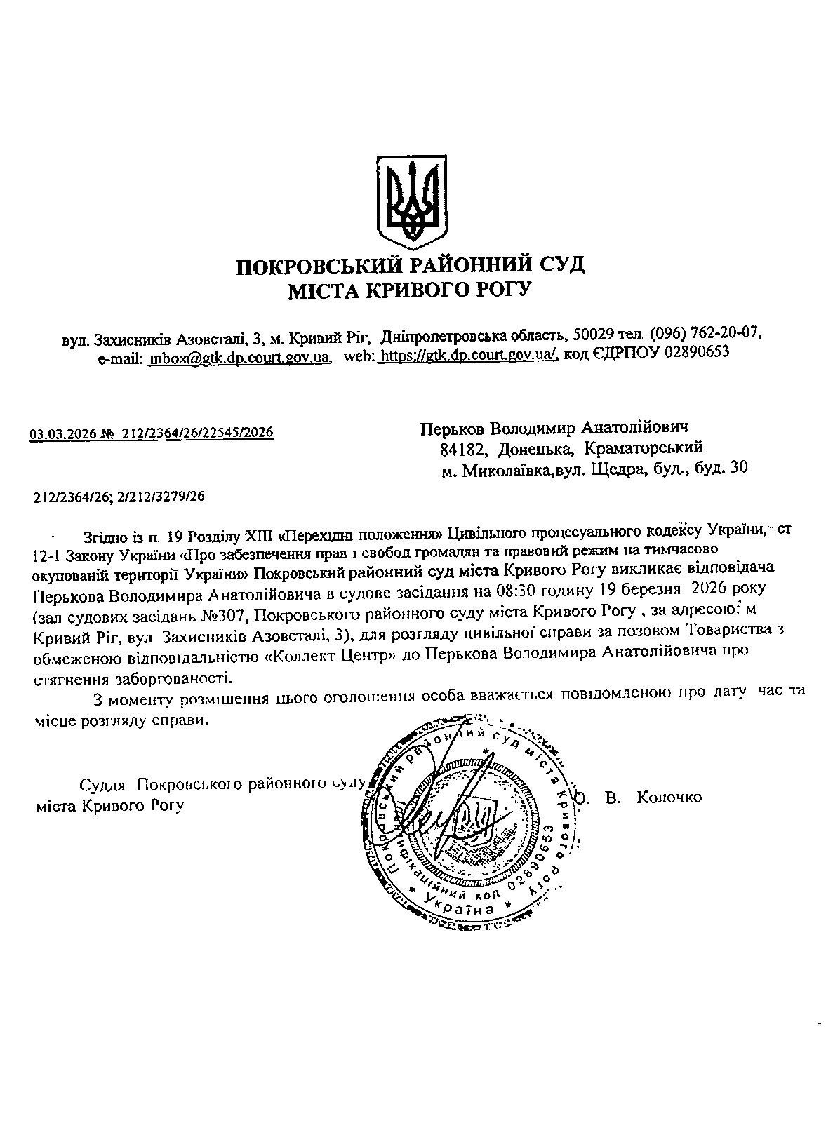 Оголошення про виклик до суду Перькова Володимира Анатолійовича
