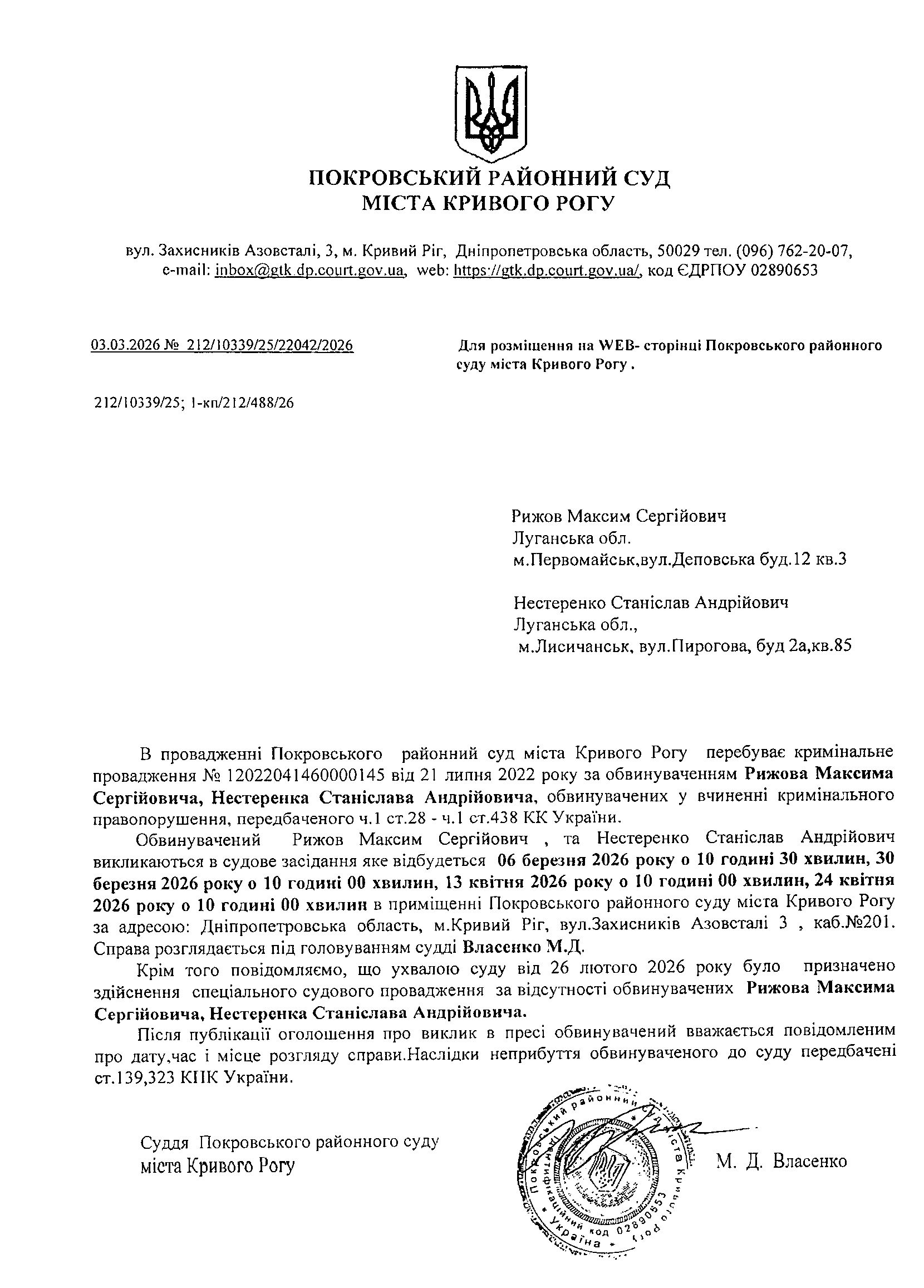 Оголошення про виклик до суду Рижова Максима Сергійовича, Нестеренка Станіслава Андрійовича