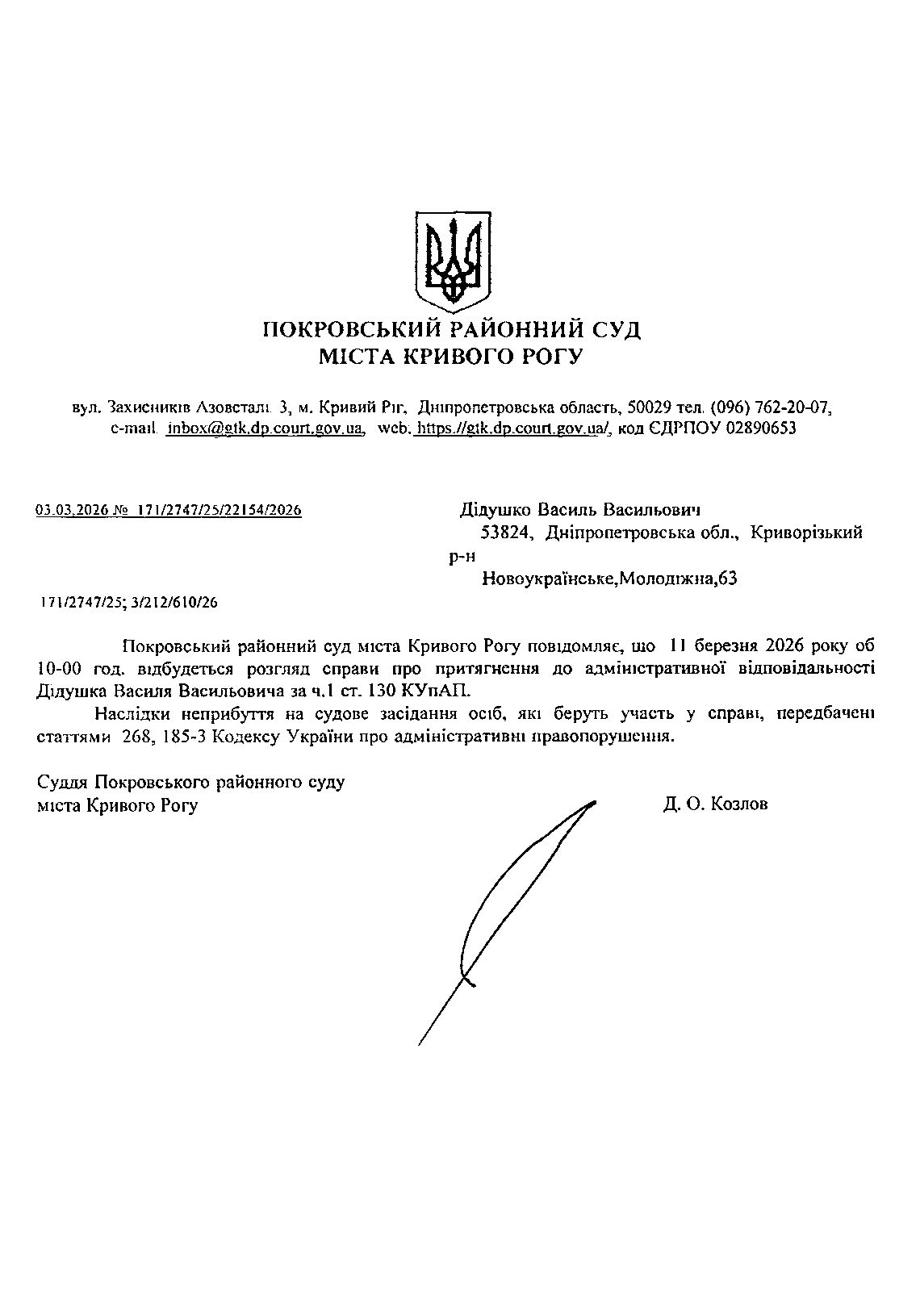 Оголошення про виклик до суду Дідушка Василя Васильовича