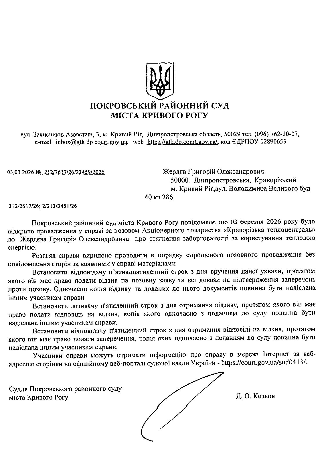 Оголошення про виклик до суду Жердєва Григорія Олександровича