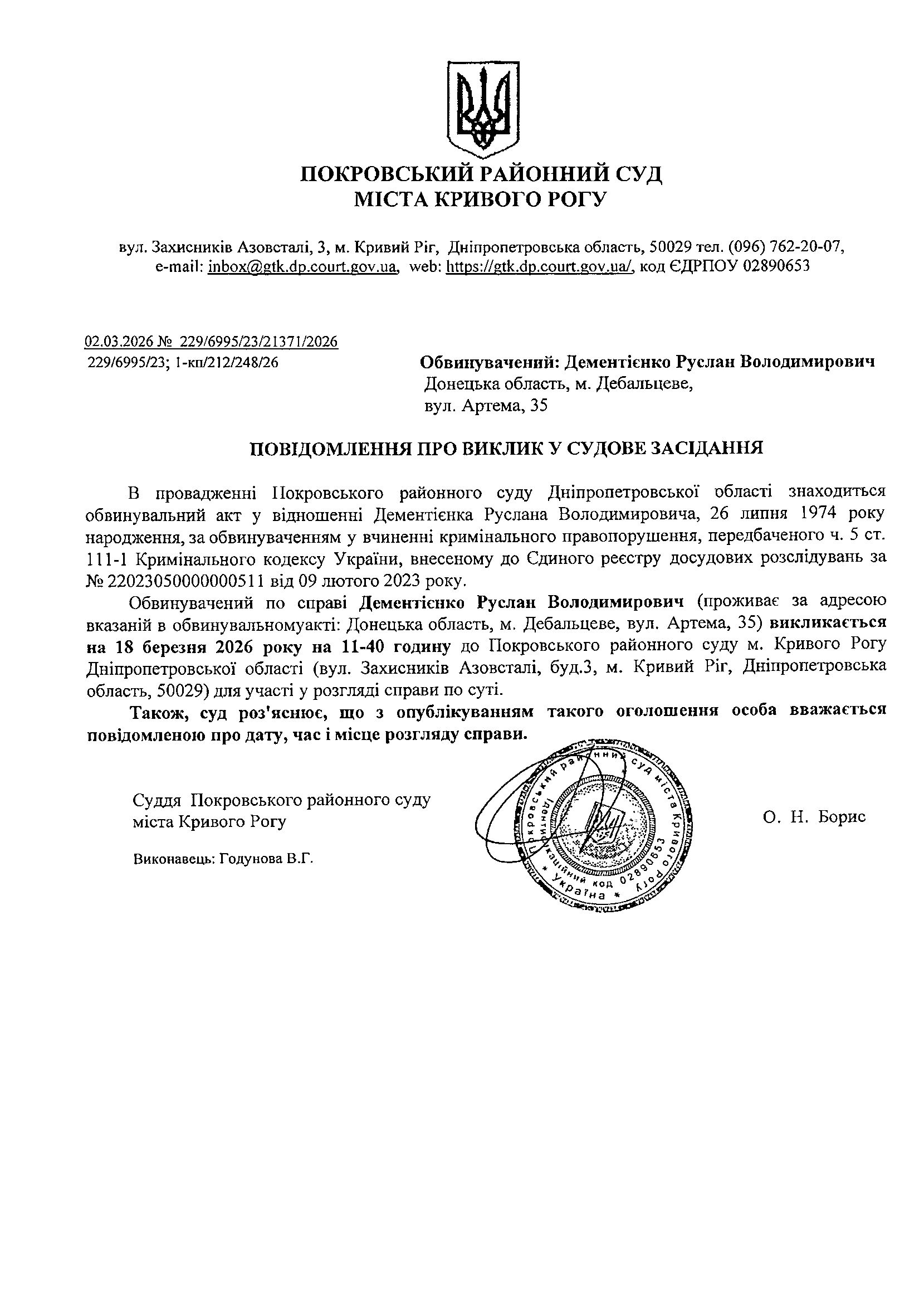 Оголошення про виклик до суду Дементієнка Руслана Володимировича