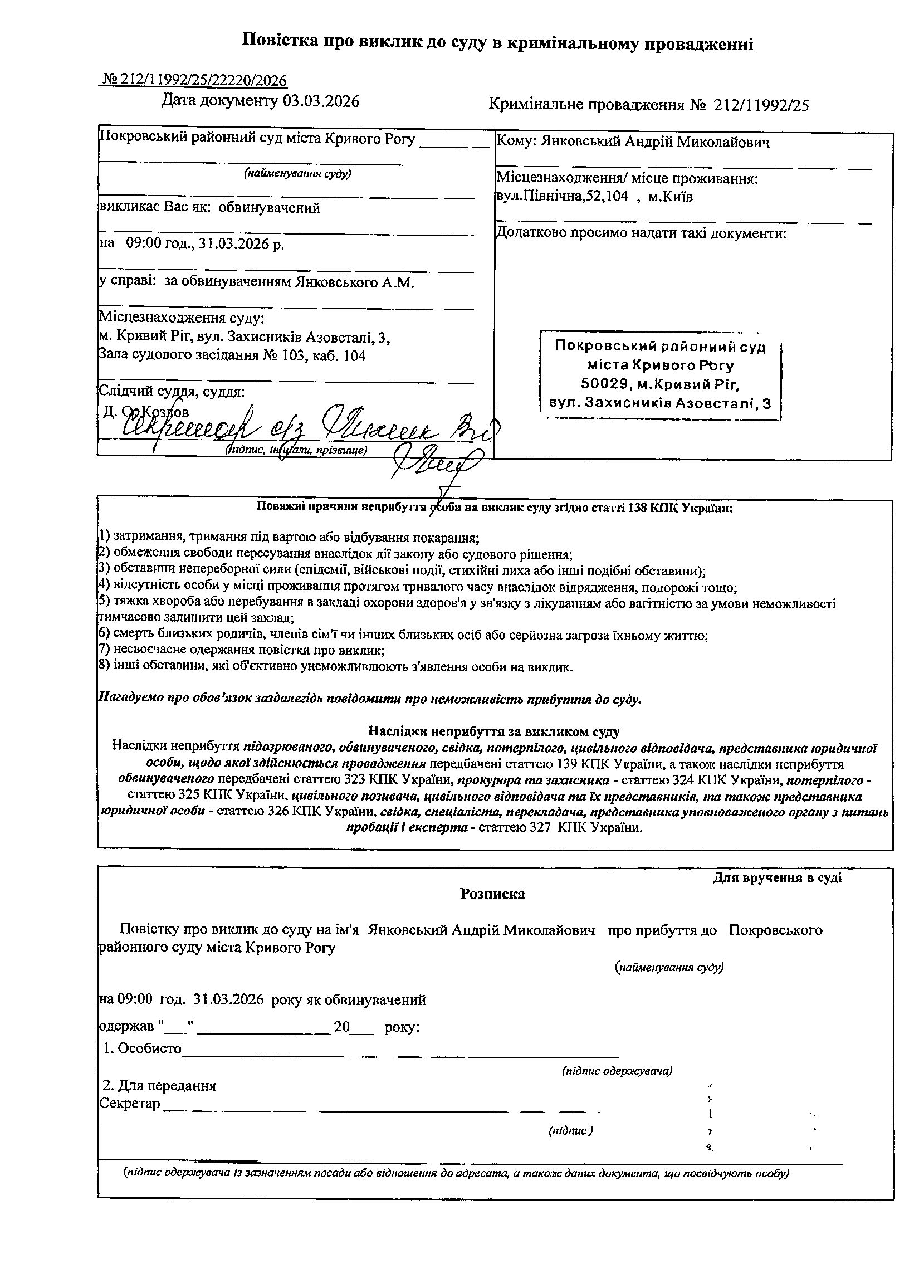 Оголошення про виклик до суду Янковськовського Андрія Миколайовича