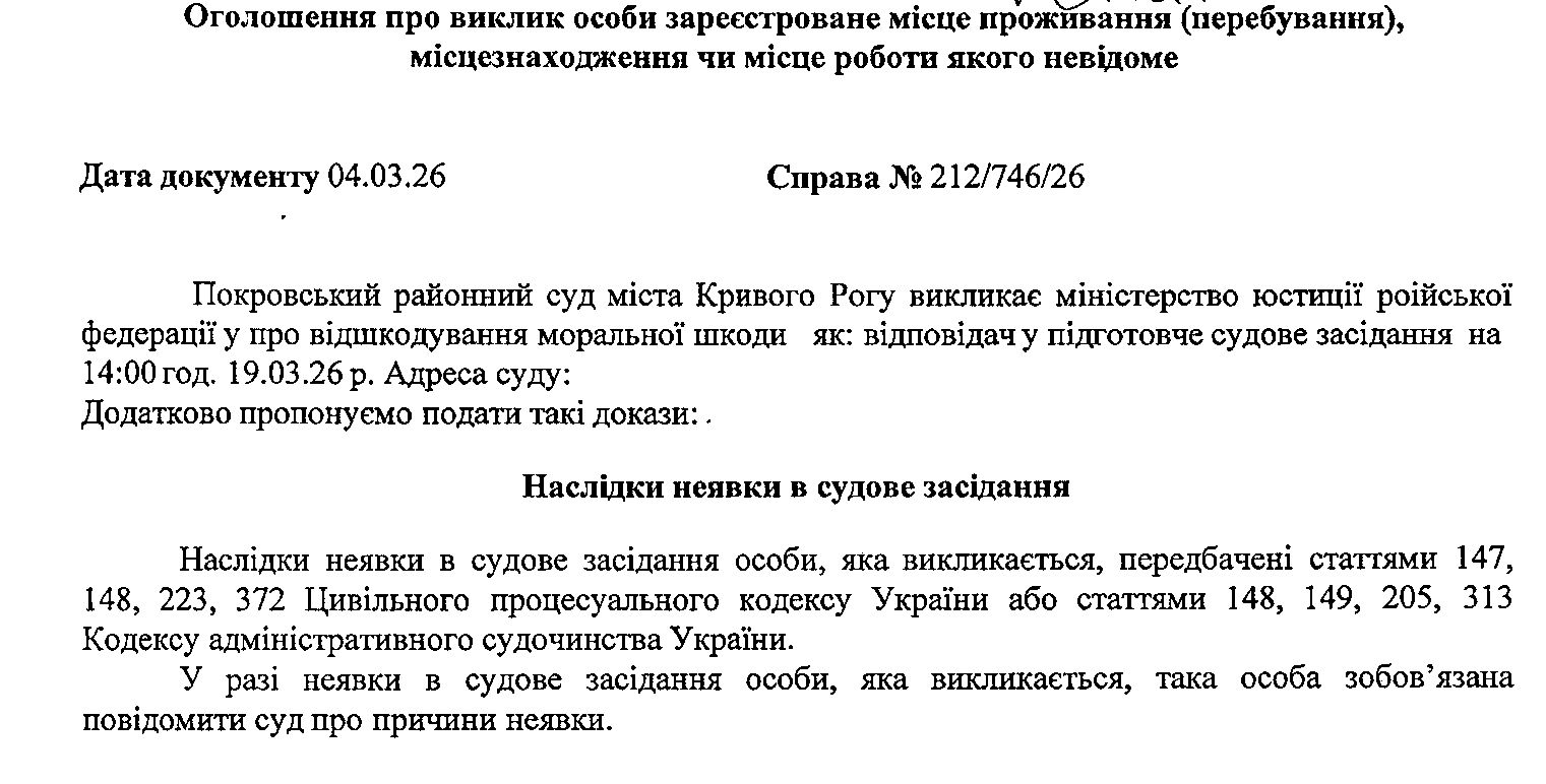 Оголошення про виклик до суду міністерства юстиції російської федерації