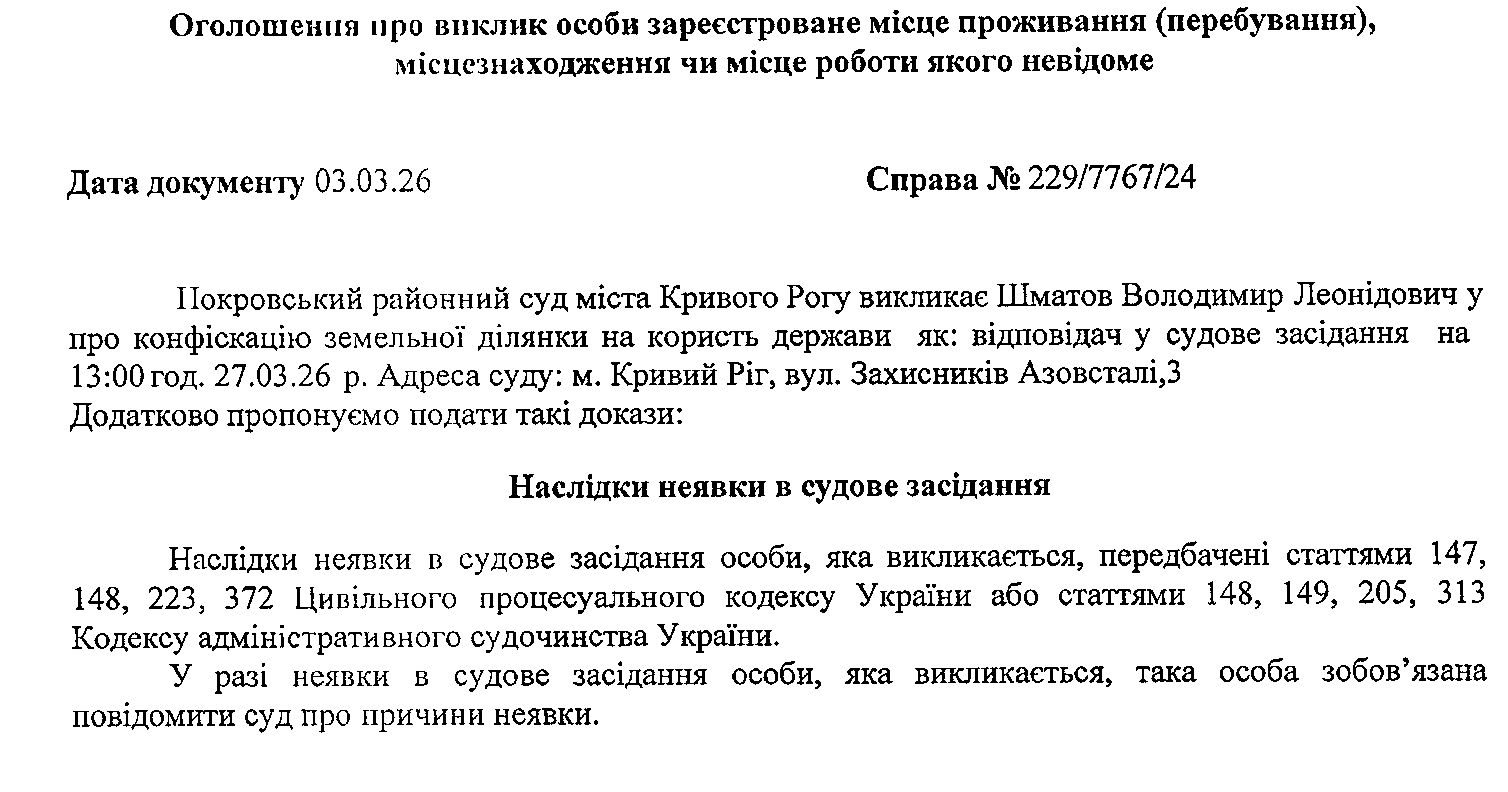 Оголошення про виклик до суду Шматова Володимира Леонідовича