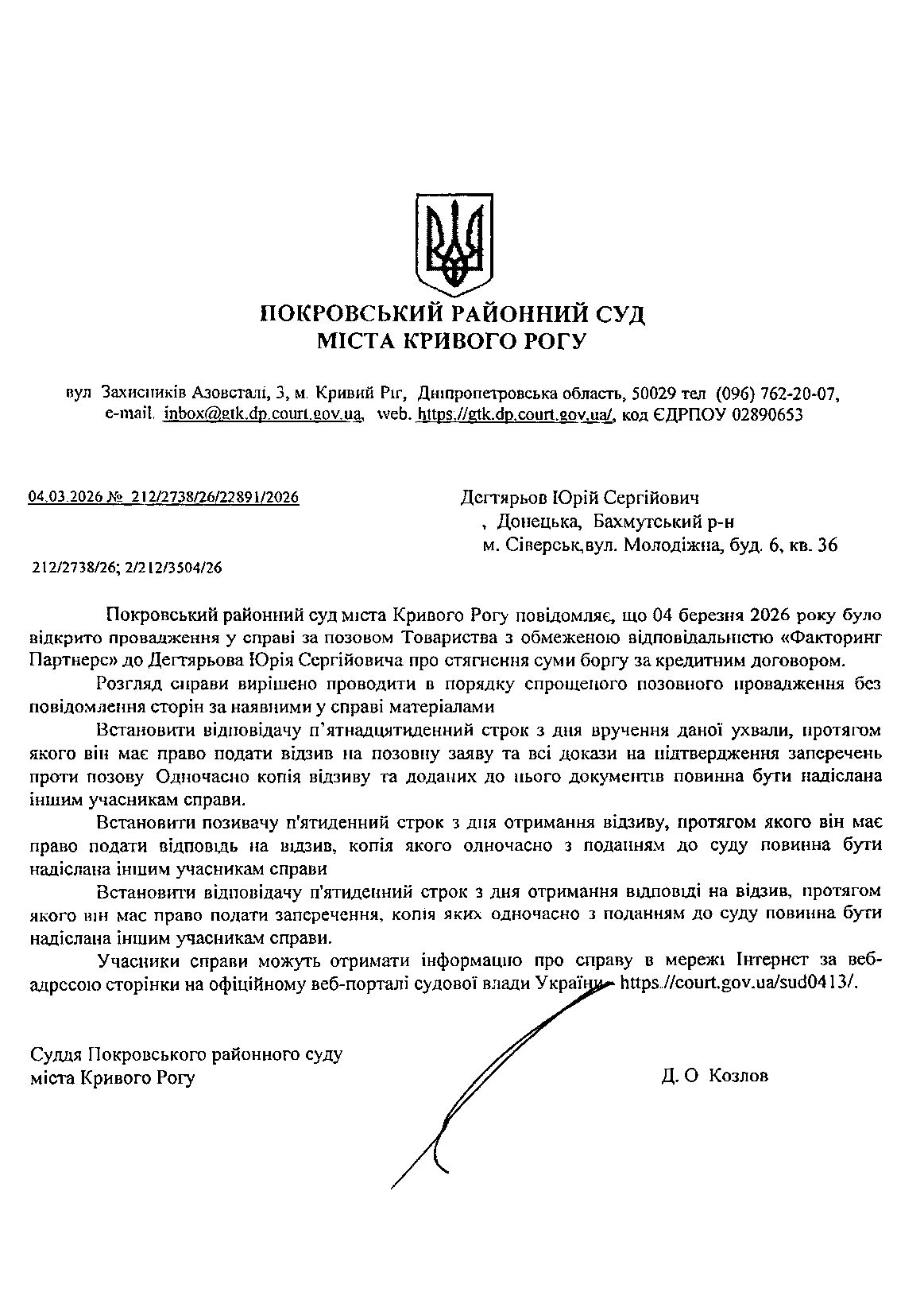 Оголошення про виклик до суду Дегтятьова Юрія Сергійовича
