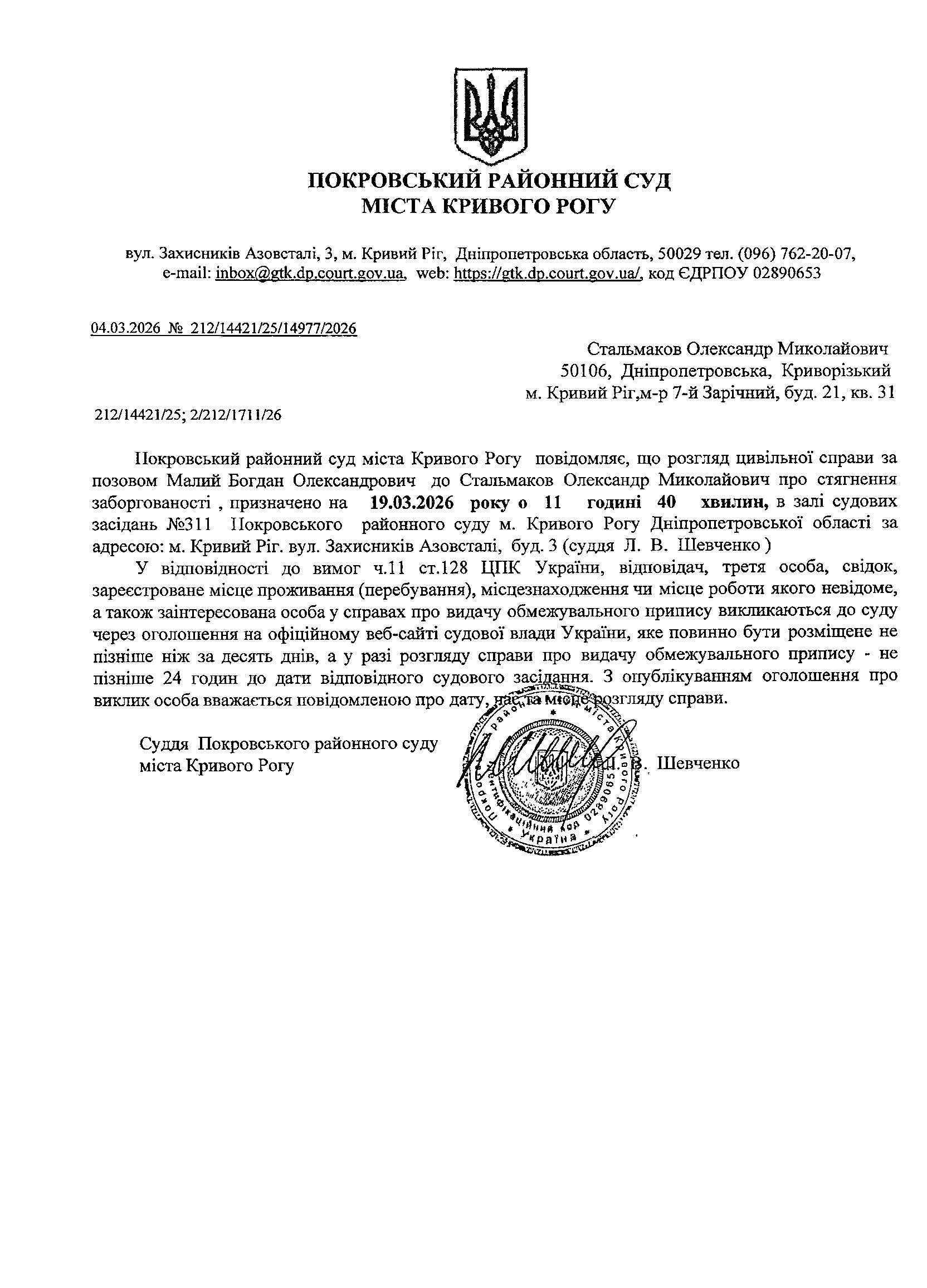 Оголошення про виклик до суду Стальмакова Олександра Миколайовича