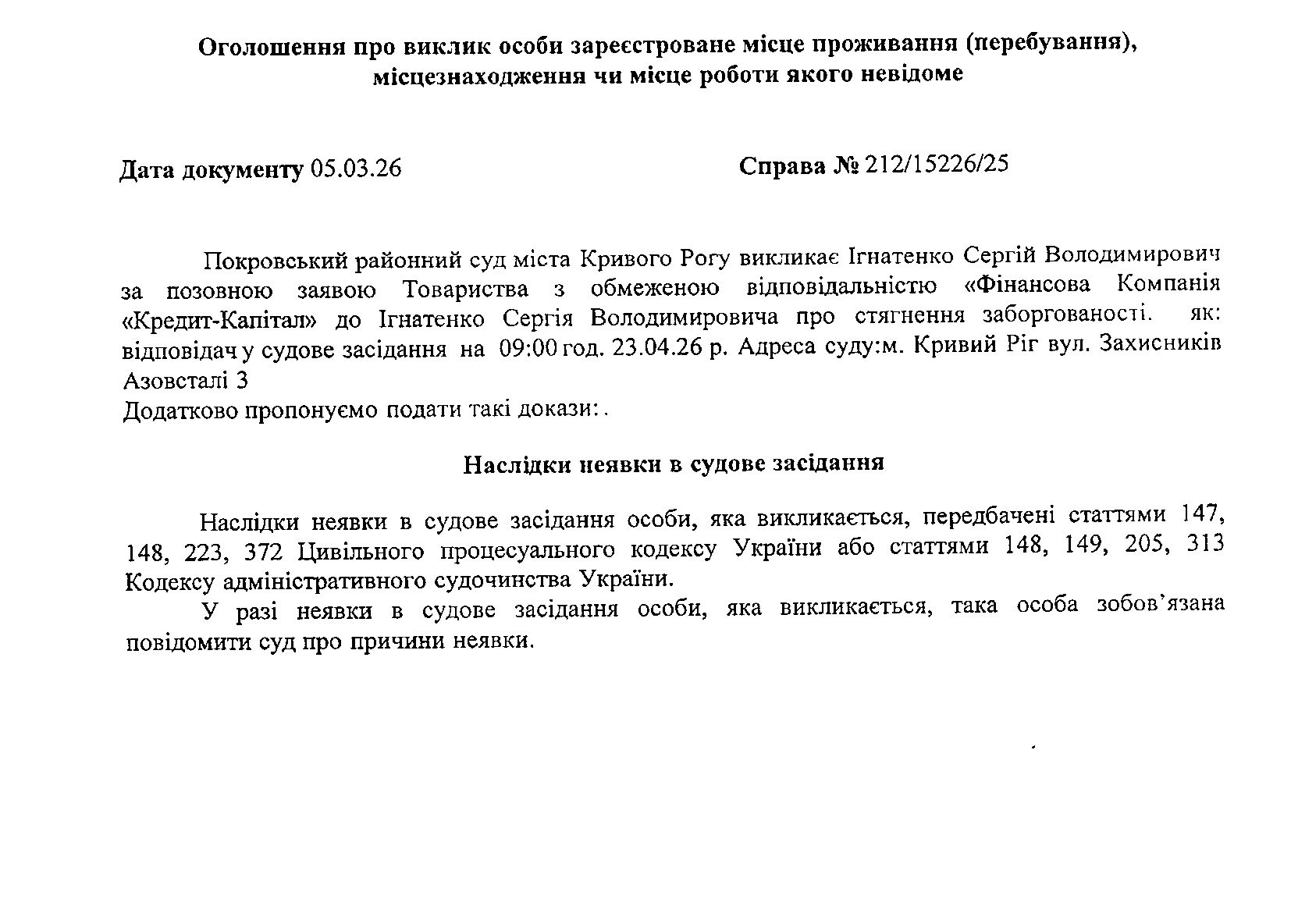 Оголошення про виклик до суду Ігнатенка Сергія Володимировича