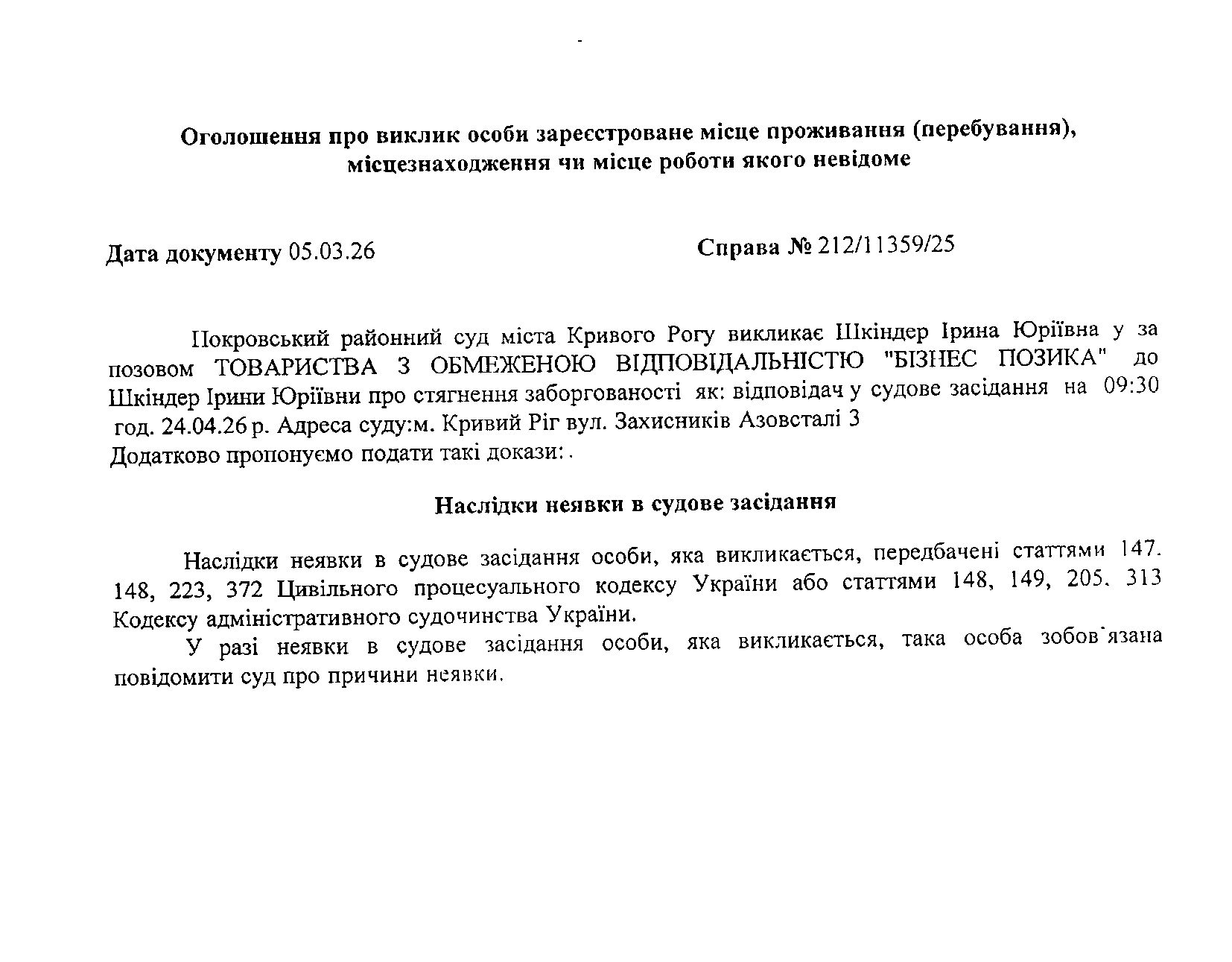 Оголошення про виклик до суду Шкіндер Ірини Юріївни
