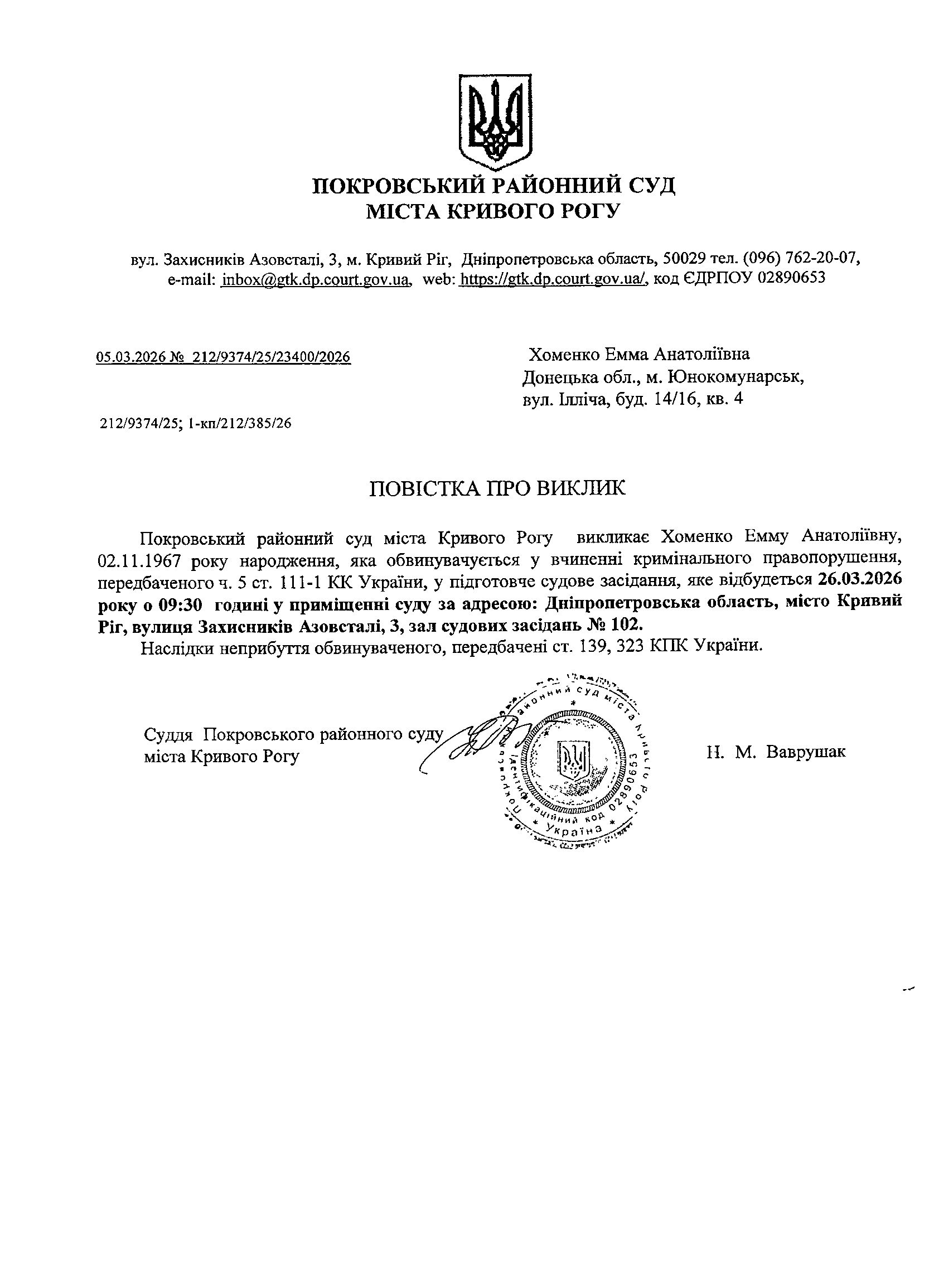Оголошення про виклик до суду Хоменко Емми Анатоліївни