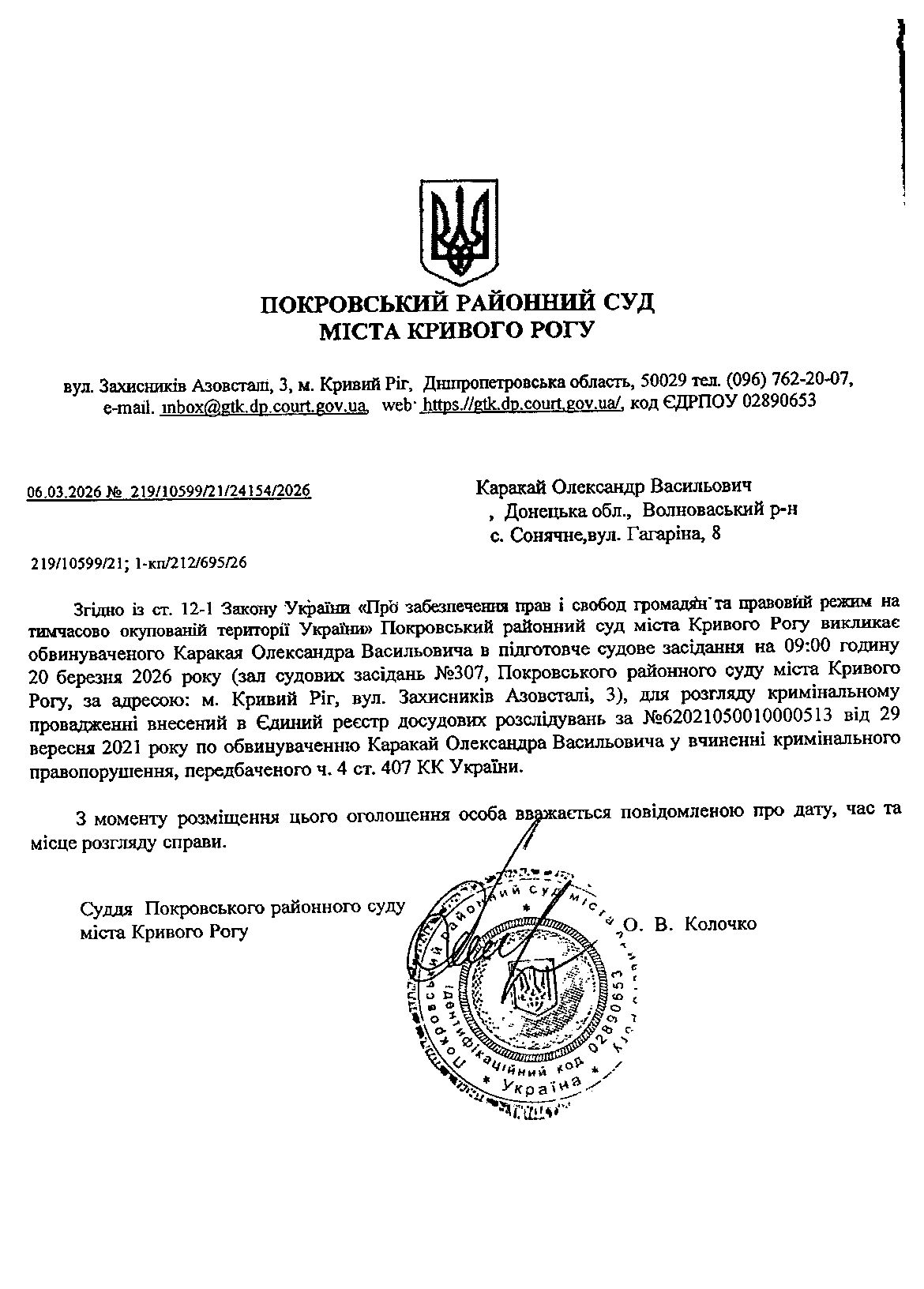 Оголошення про виклик до суду Каракай Олександра Васильовича