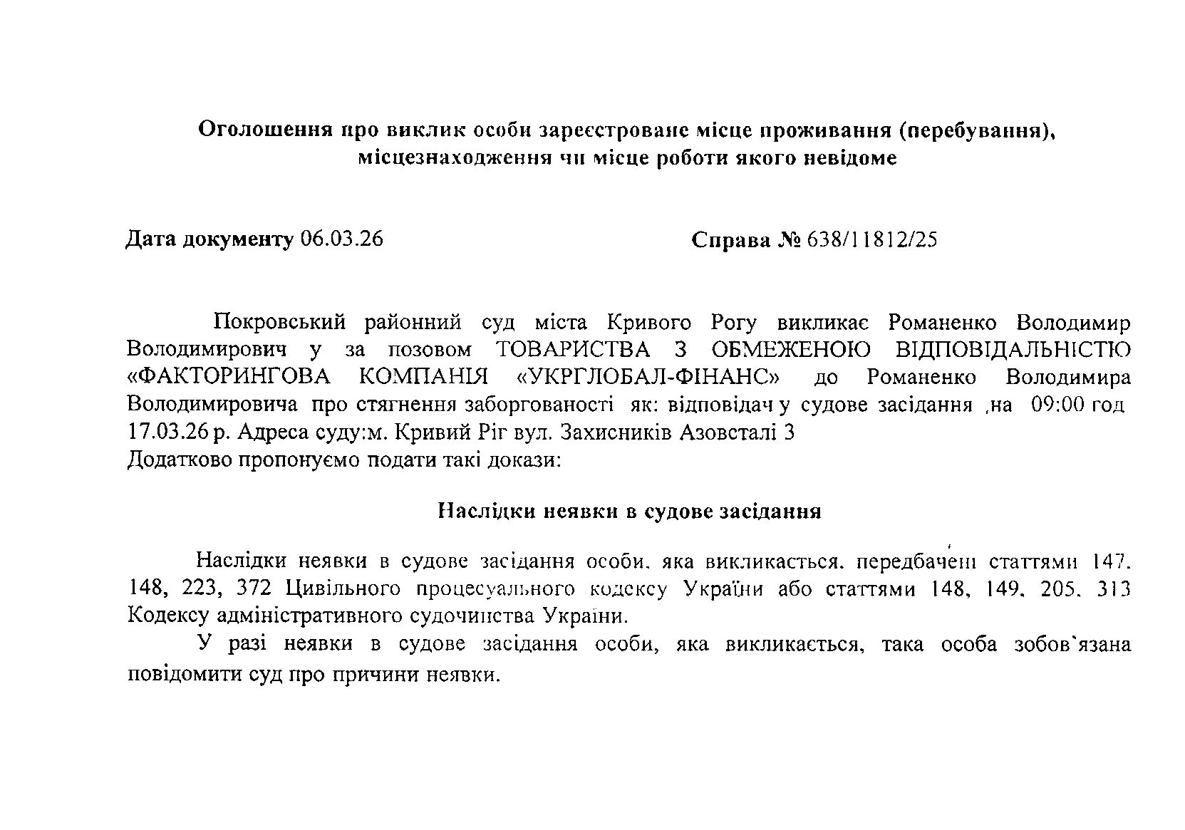 Оголошення про виклик до суду Романенка Володимира Володимировича