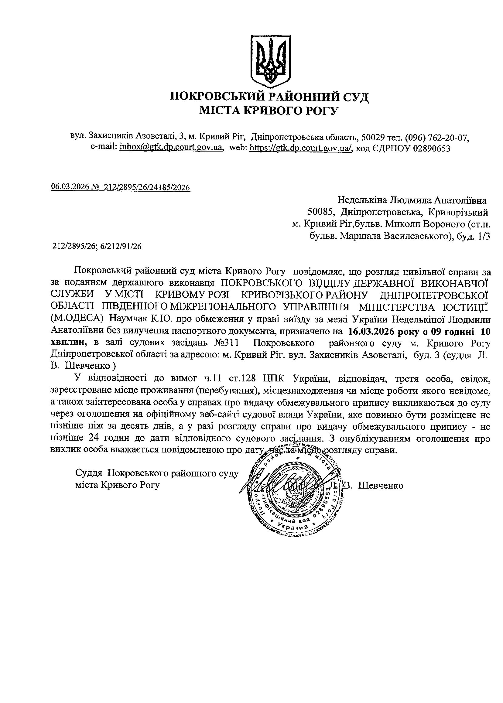 Оголошення про виклик до суду Неделькіної Людмили Анатоліївни