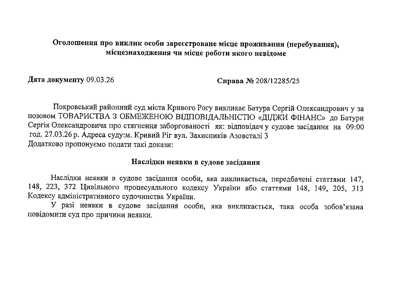 Оголошення про виклик до суду Батури Сергія Олександровича