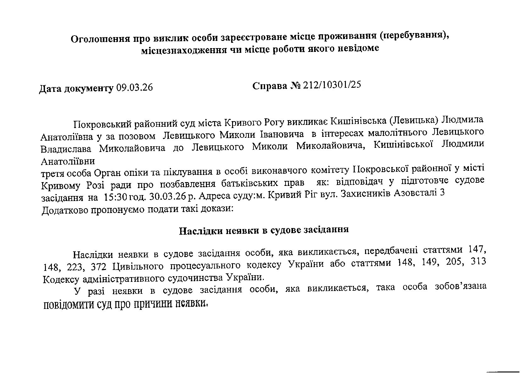 Оголошення про виклик до суду Кишинівську (Левицьку) Людмилу Анатоліївну