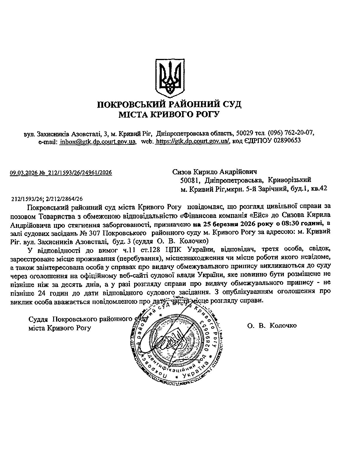Оголошення про виклик до суду Сизова Кирила Андрійовича