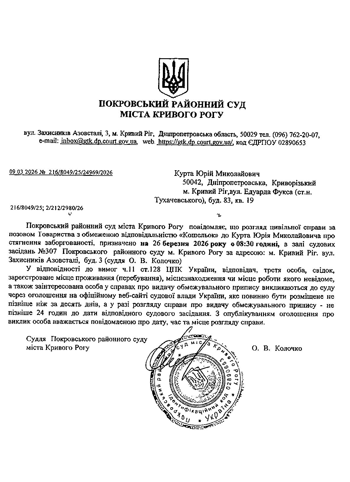 Оголошення про виклик до суду Курта Юрія Миколайовича