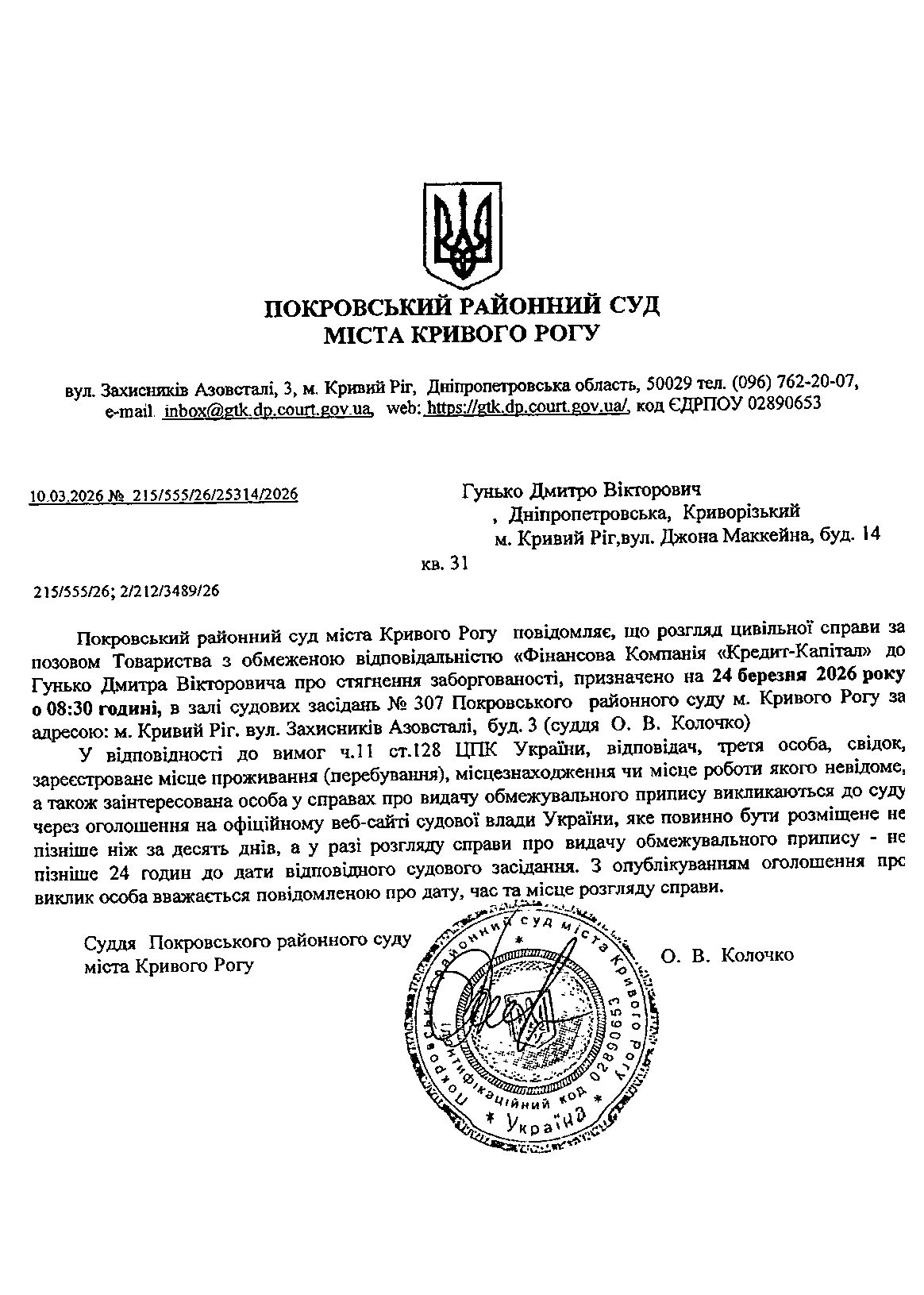 Оголошення про виклик до суду Гунька Дмитра Вікторовича