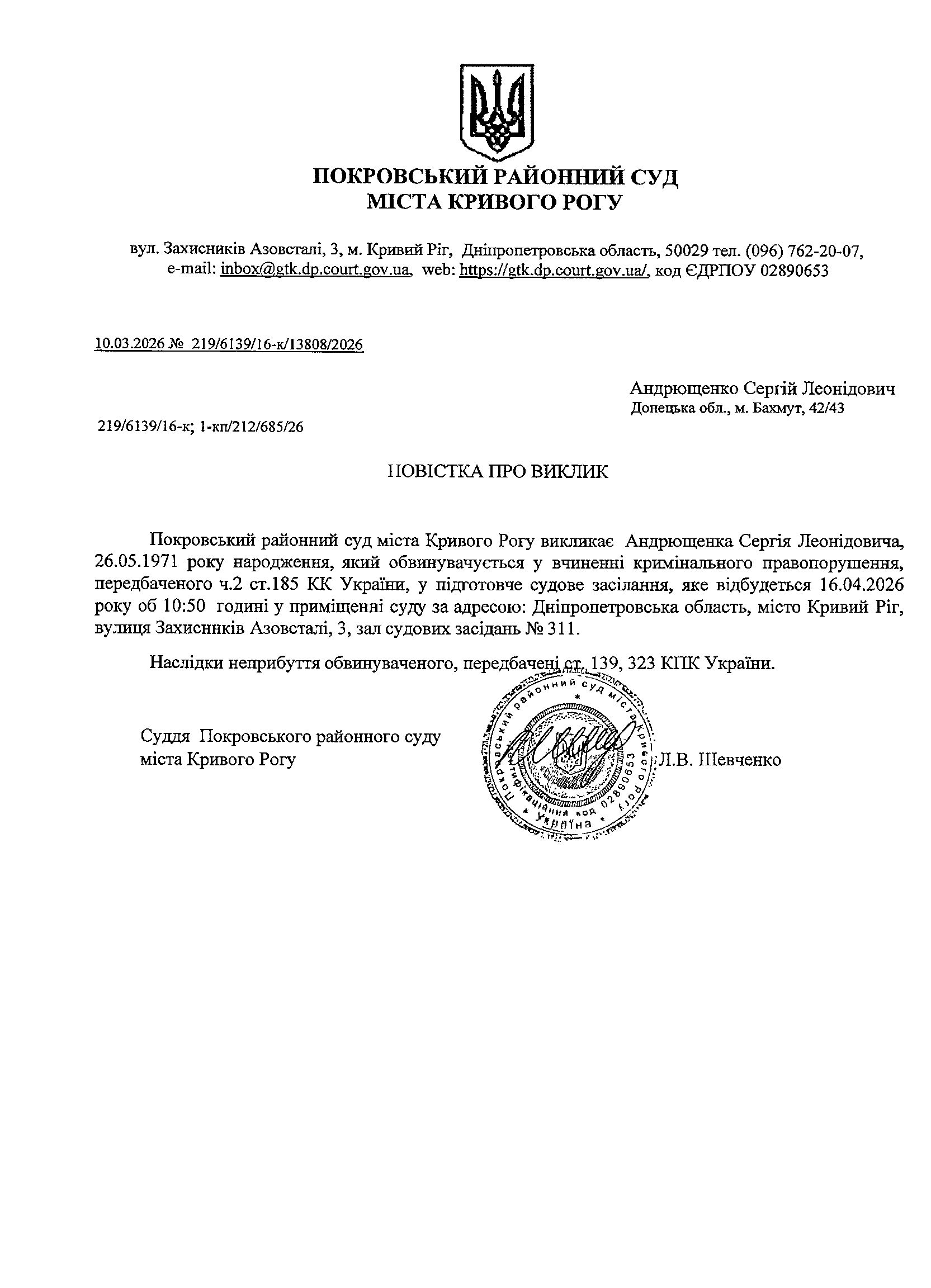 Оголошення про виклик до суду Андрющенка Сергія Леонідовича