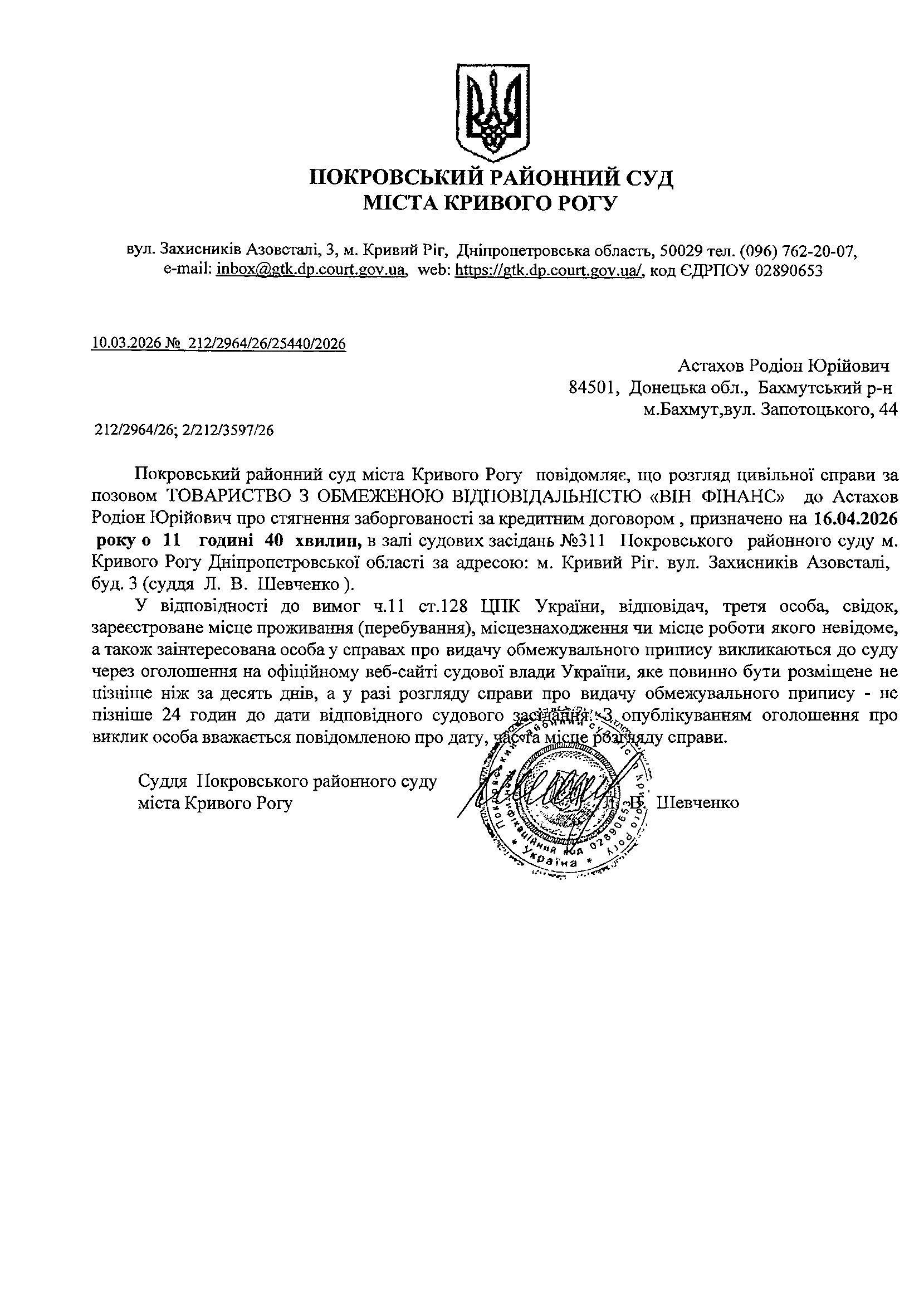 Оголошення про виклик до суду Астахова Родіона Юрійовича