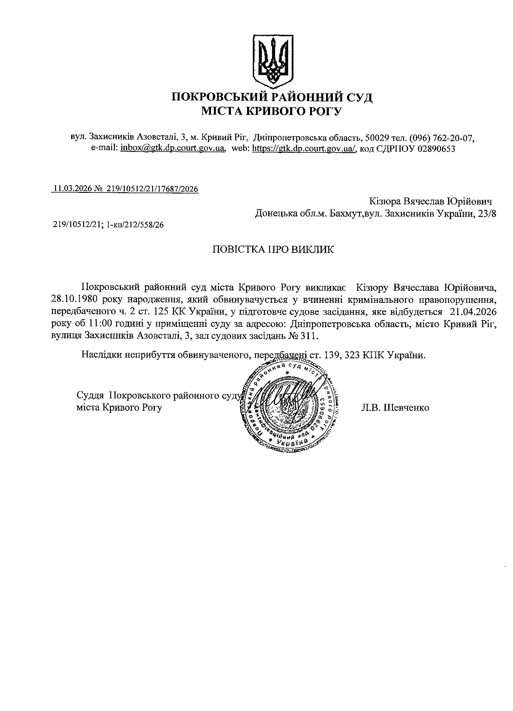 Оголошення про виклик до суду Кізюри Вячеслава Юрійовича