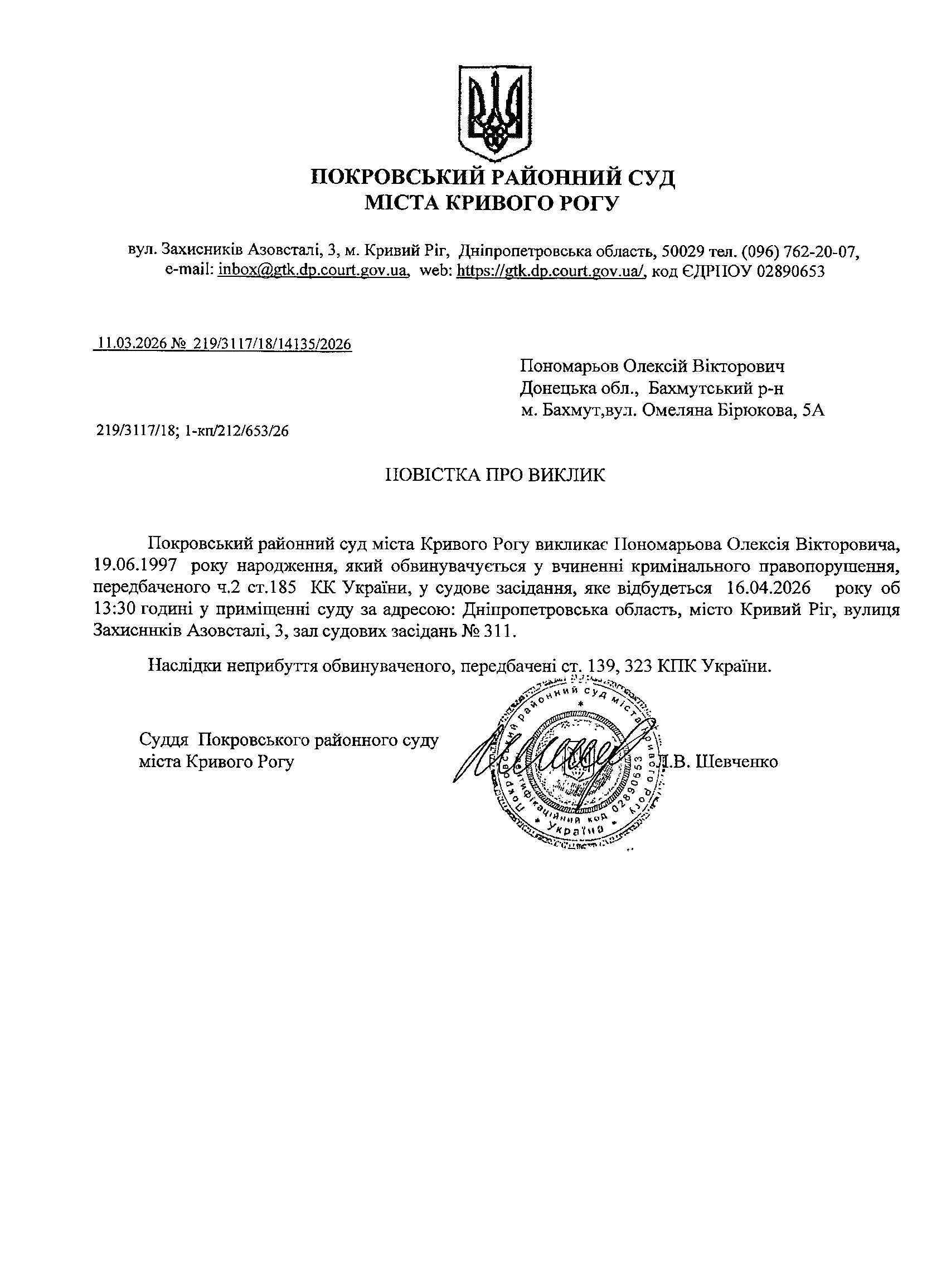Оголошення про виклик до суду Пономарьова Олексія Вікторовича