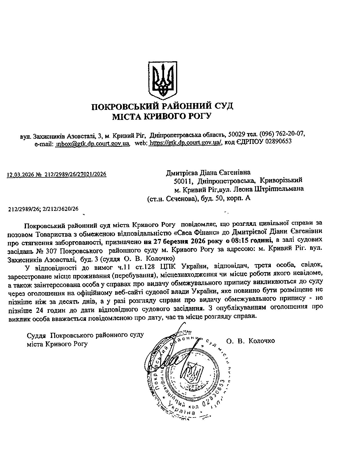 Оголошення про виклик до суду Дмитрієвої Діани Євгенівни