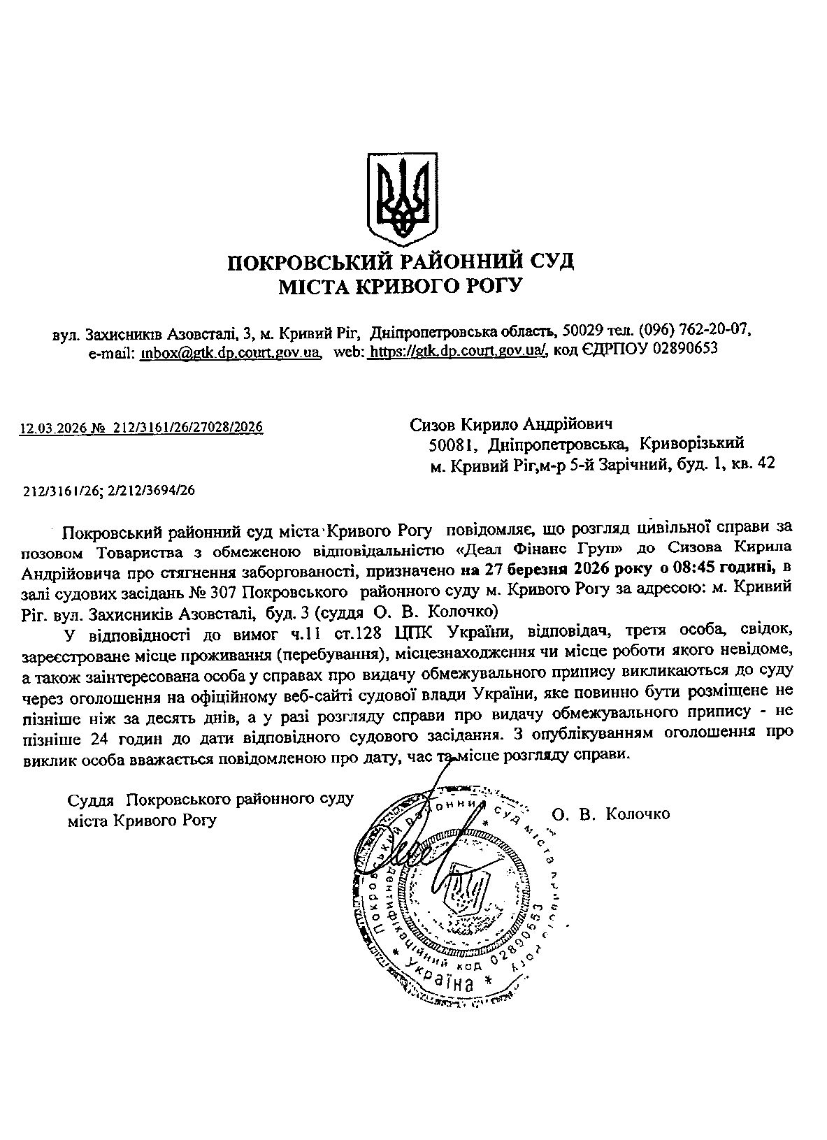 Оголошення про виклик до суду Сизова Кирила Андрійовича