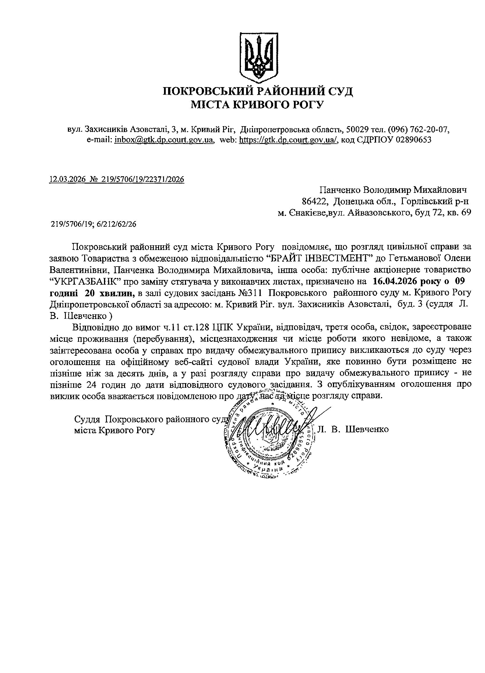 Оголошення про виклик до суду Панченка Володимира Михайловича