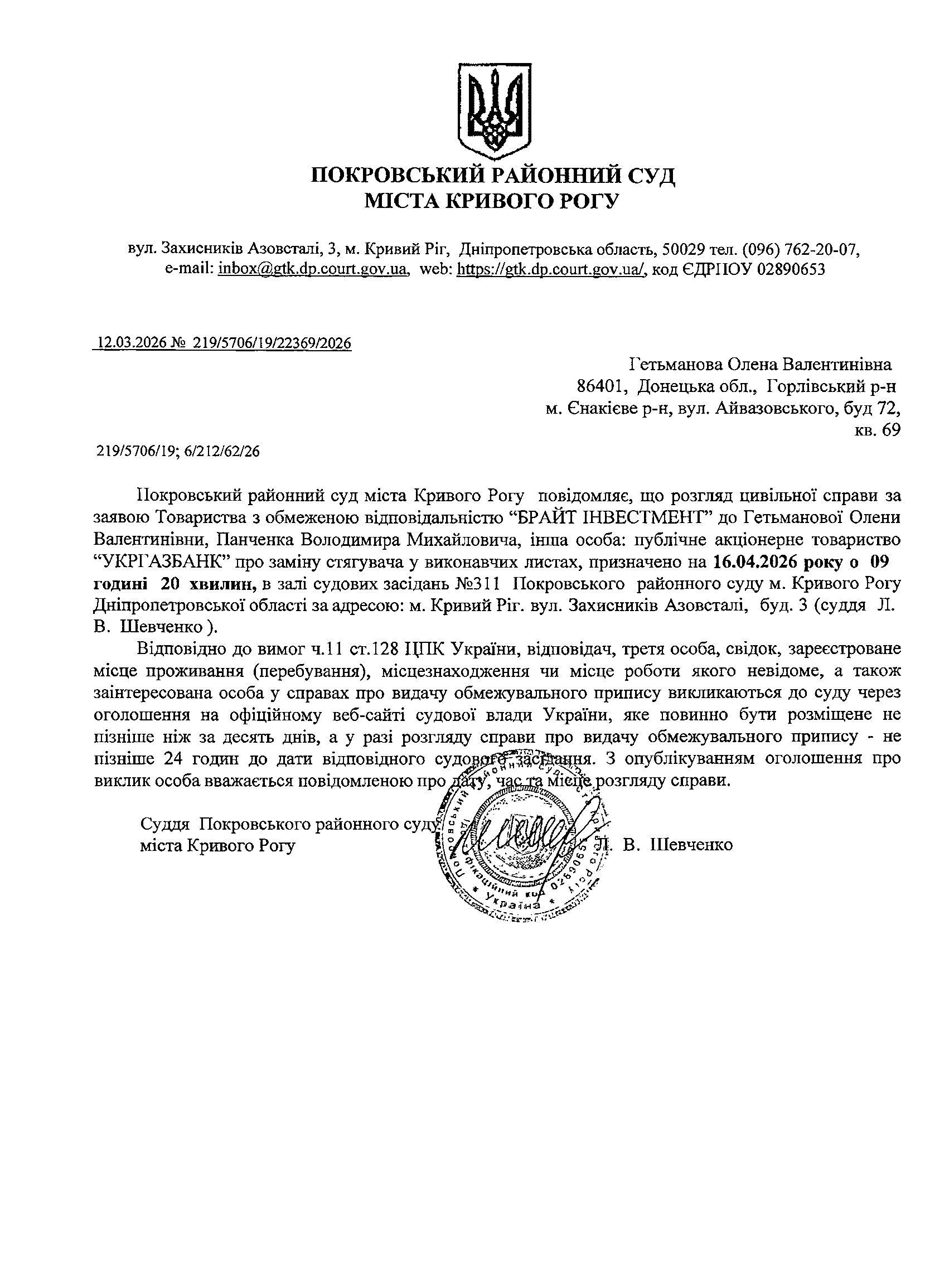 Оголошення про виклик до суду Гетьмаової Олени Валентинівни
