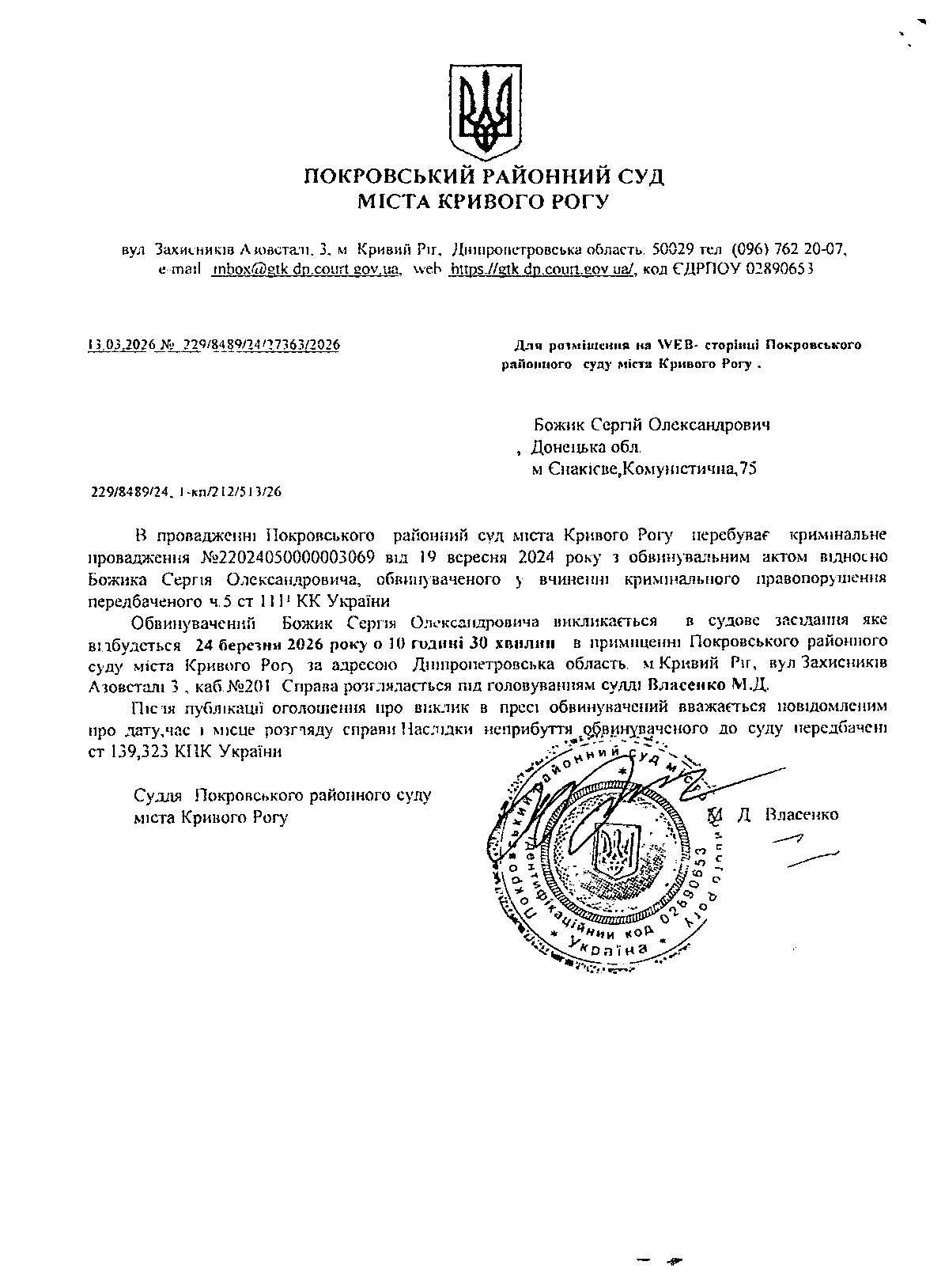 Оголошення про виклик до суду Божика Сергія Олександровича