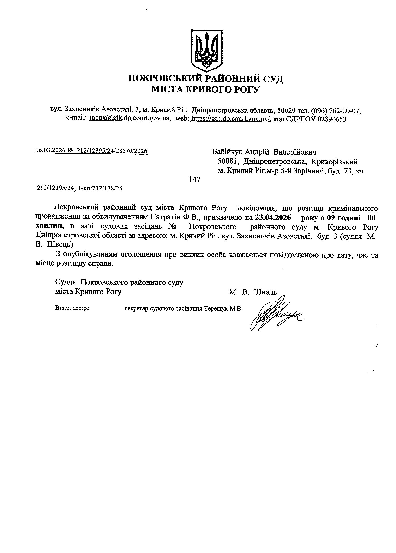 Оголошення про виклик до суду Бабійчука Андрія Валерійовича