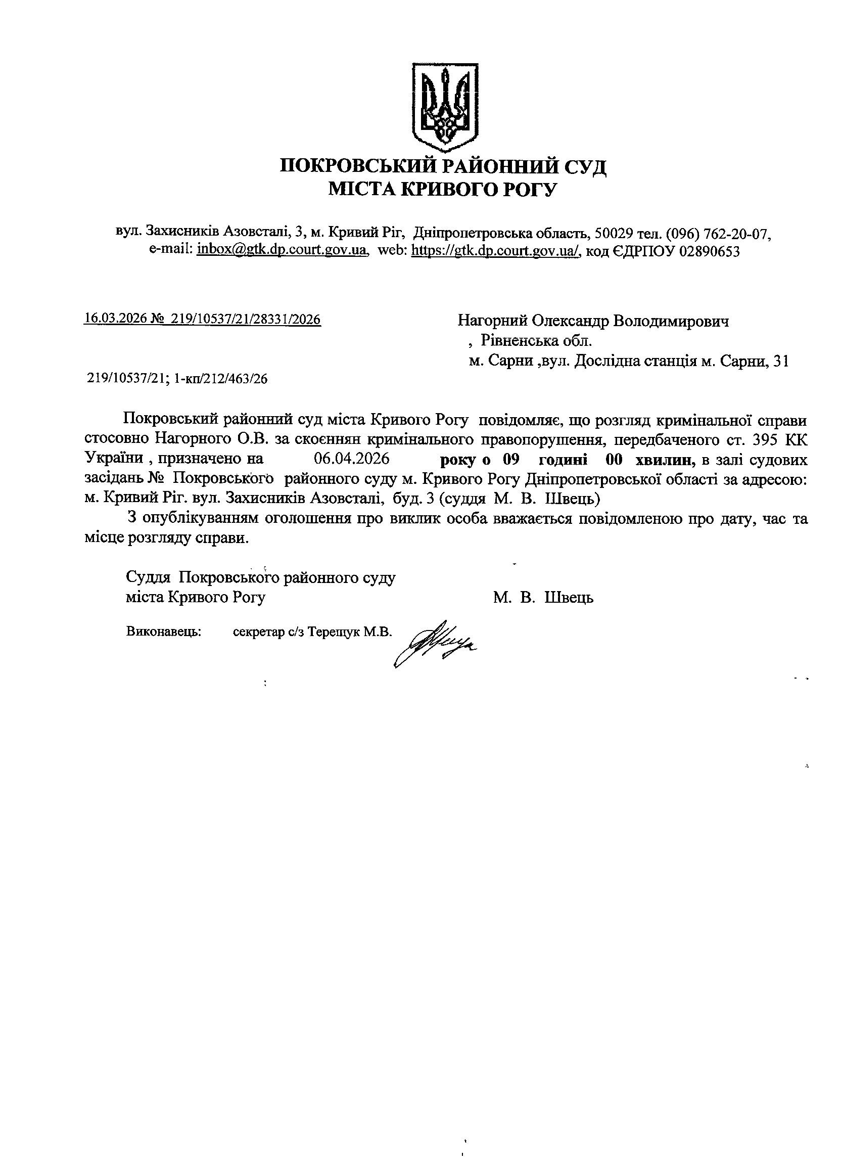 Оголошення про виклик до суду Нагорного Олександра Володимировича