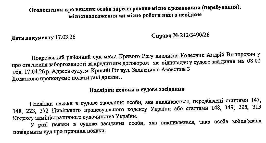 Оголошення про виклик до суду Колесника Андрія Вікторовича