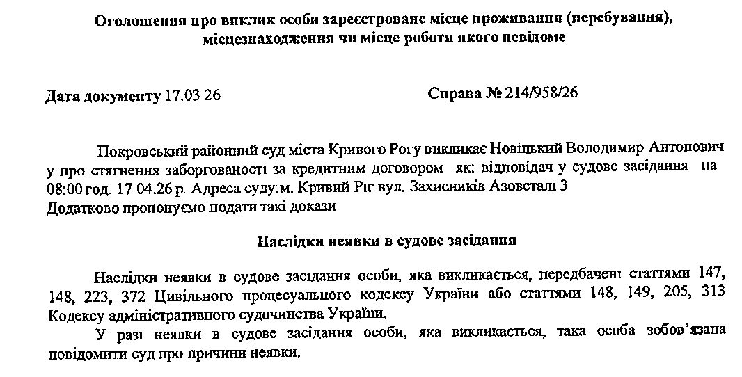 Оголошення про виклик до суду Новіцького Володимира Антоновича