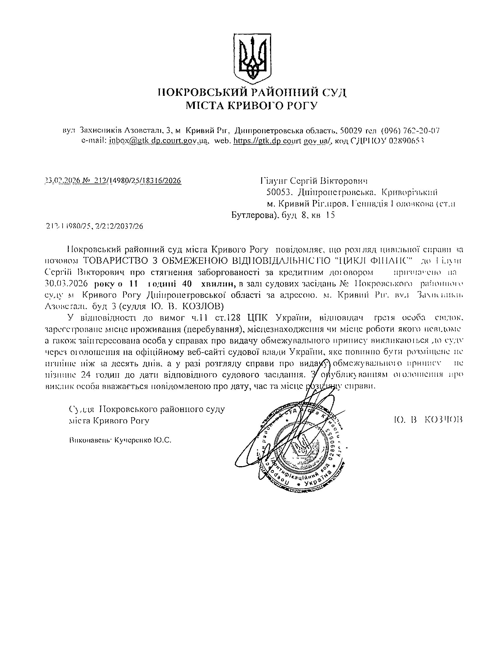 Оголошення про виклик до суду Гілунга Сергія Вікторовича
