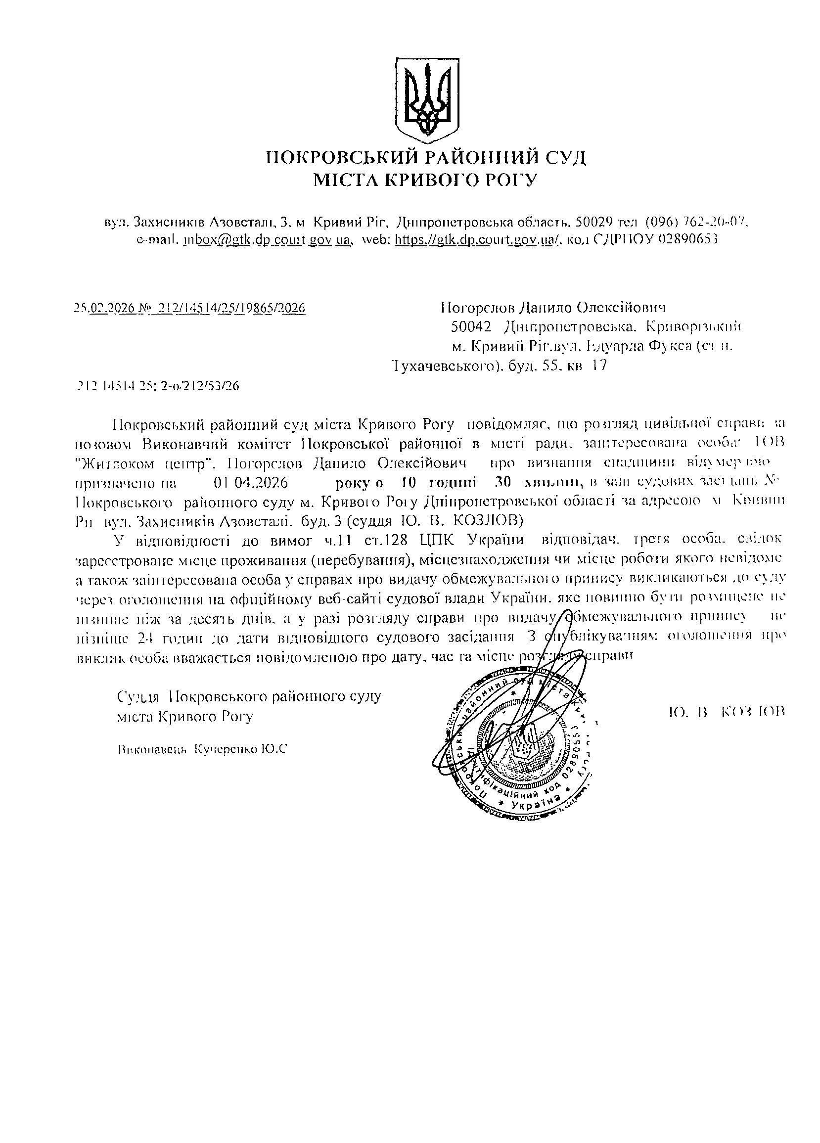 Оголошення про виклик до суду Погорєлова Данила Олексійовича