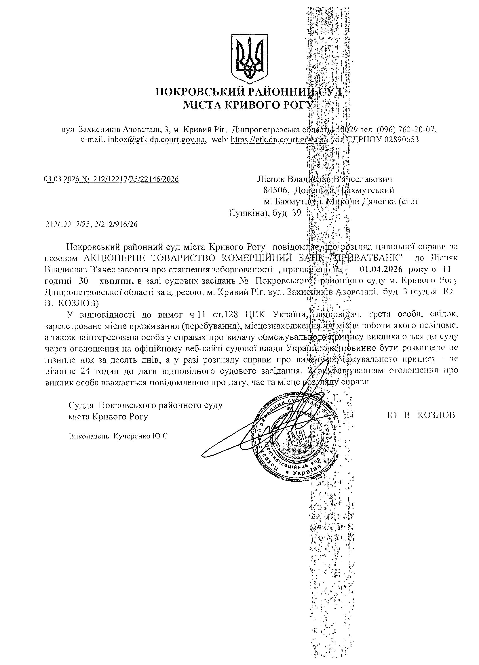 Оголошення про виклик до суду Лісняка Владислава В'ячеславовича
